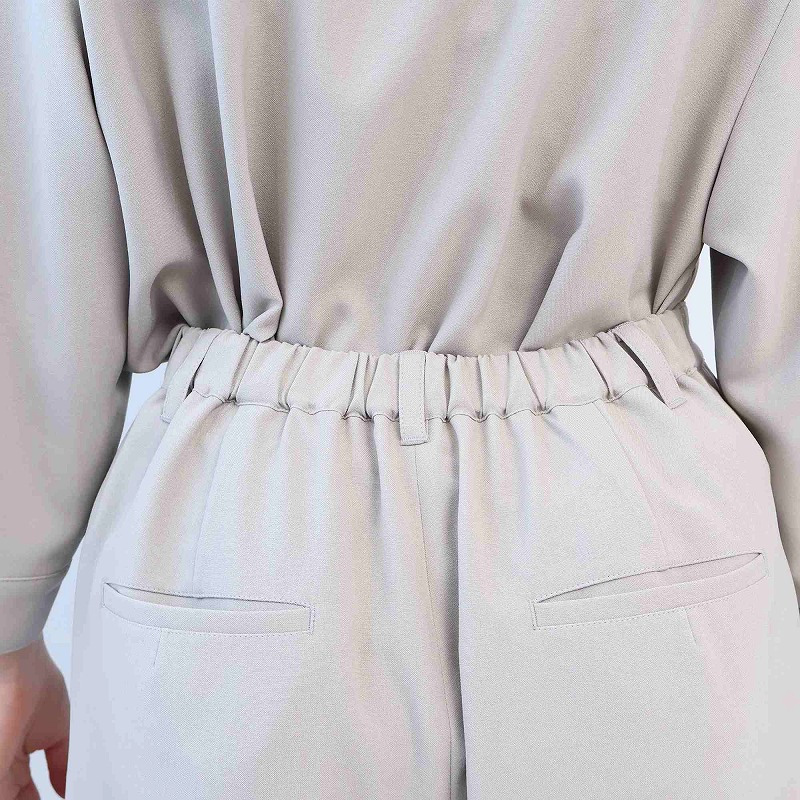 フロントは前開きファスナーできちんと感を保ちつつ、後ろはゴム仕様。
