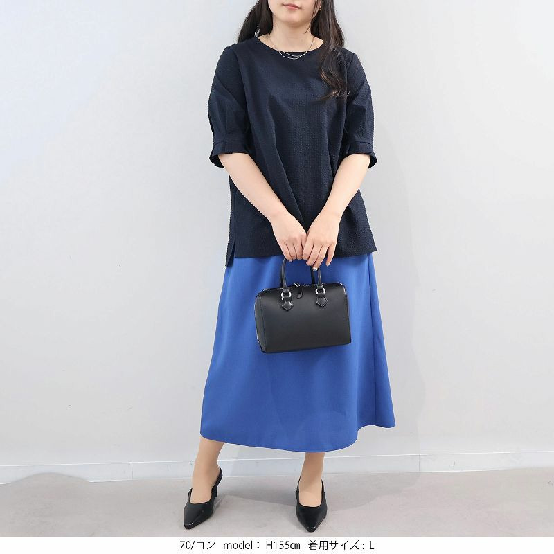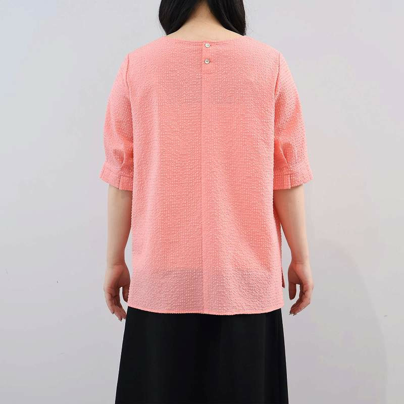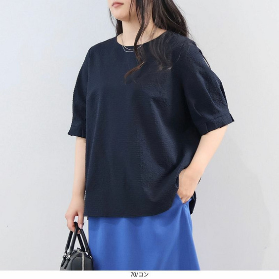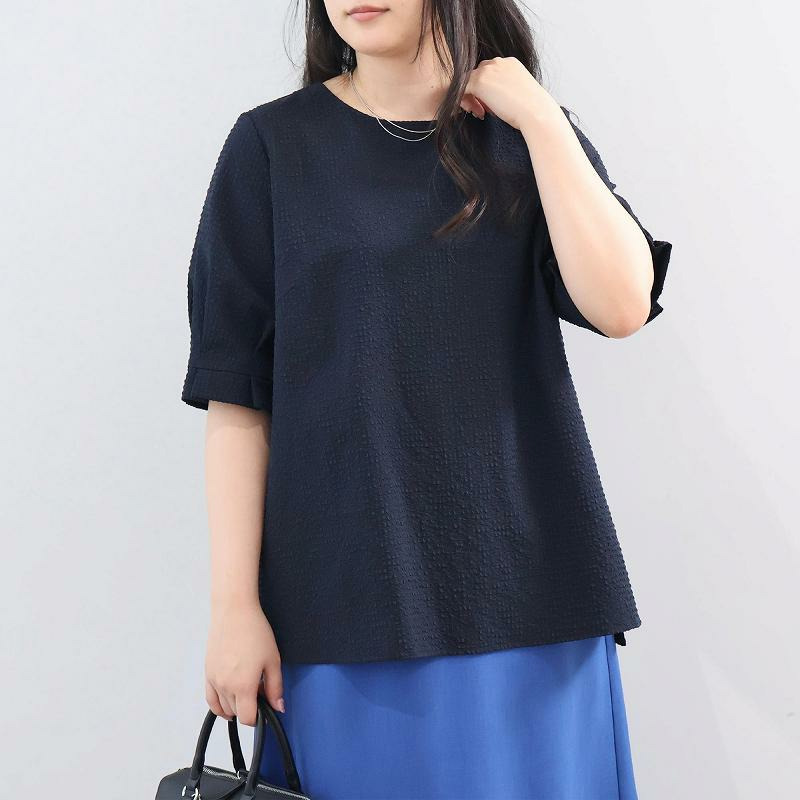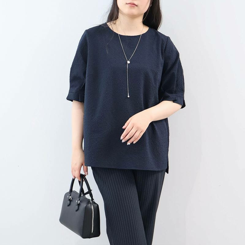 二の腕を優しくカバーする5分袖丈で、女性らしい柔らかな印象と安心感を与えてくれます。