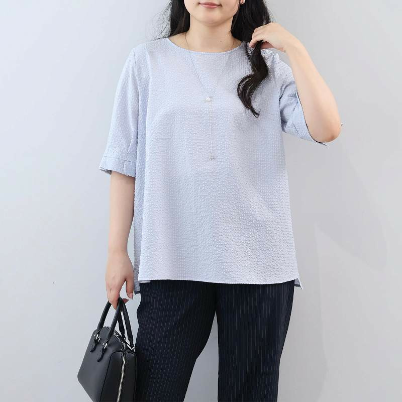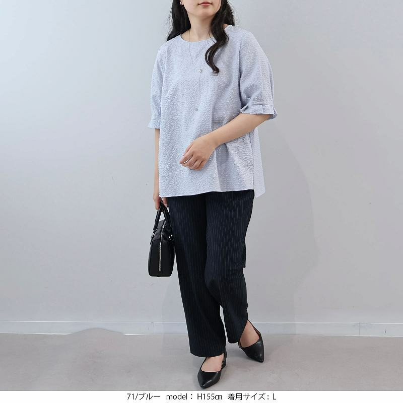 デニムのワイドパンツや、落ち感のあるロングスカートと合わせた大人カジュアルなスタイル。サッカー素材の軽やかさが、暑い日のリラクシーなお出かけ着として幅広く活躍する1枚です。