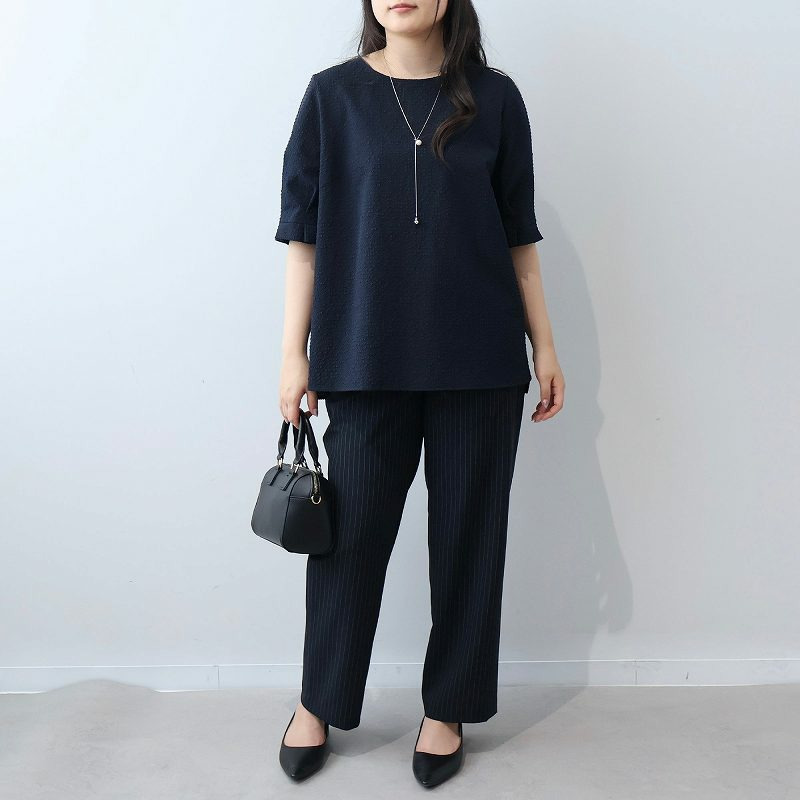 サッカー素材の涼やかな質感と、ポワン袖の華やかさを活かした着こなしがおすすめです。
