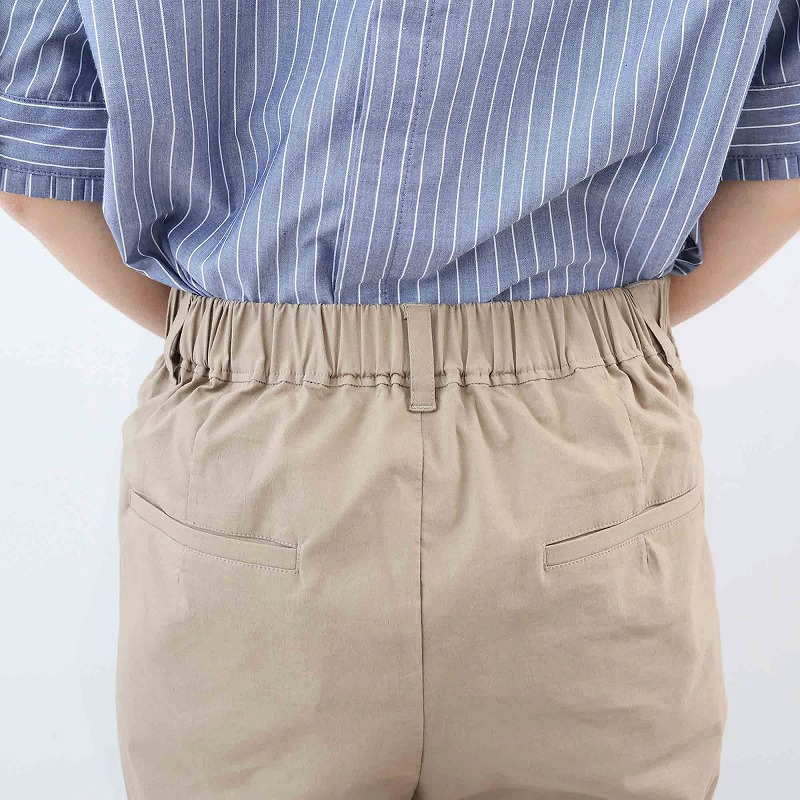 一方、後ろゴム仕様を採用しているため、お腹周りの圧迫感が少なく、デスクワークなどの長時間の着用もストレスフリー。
