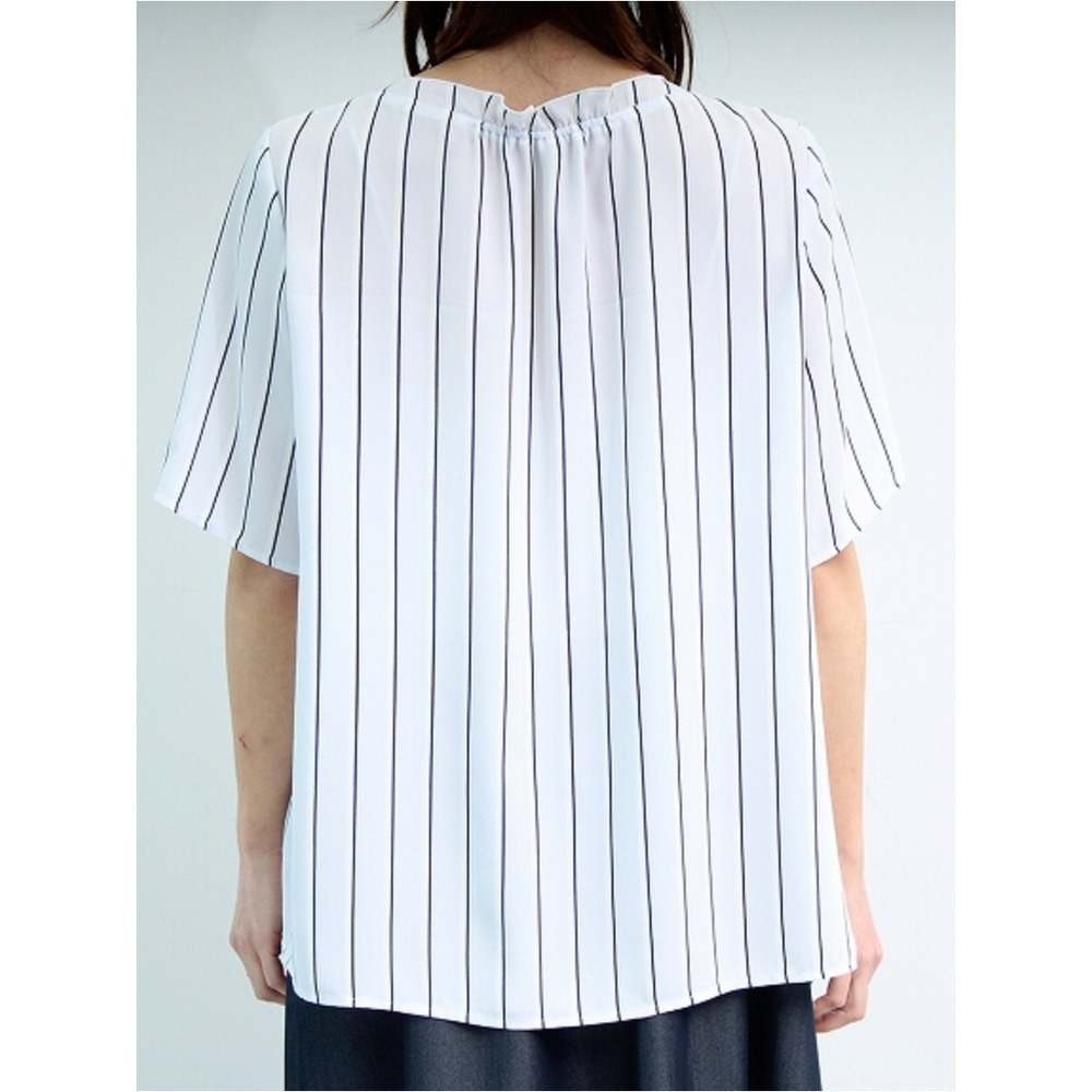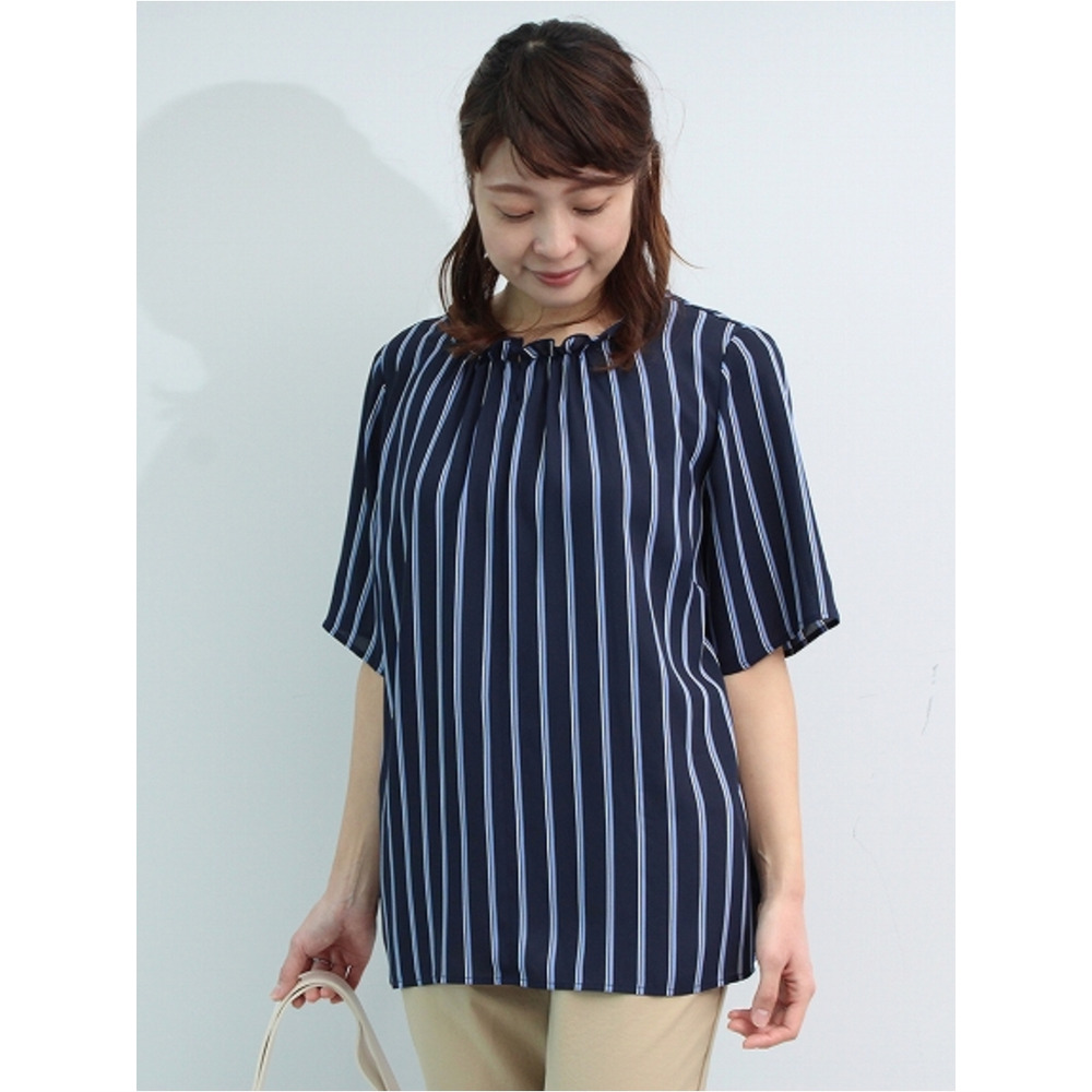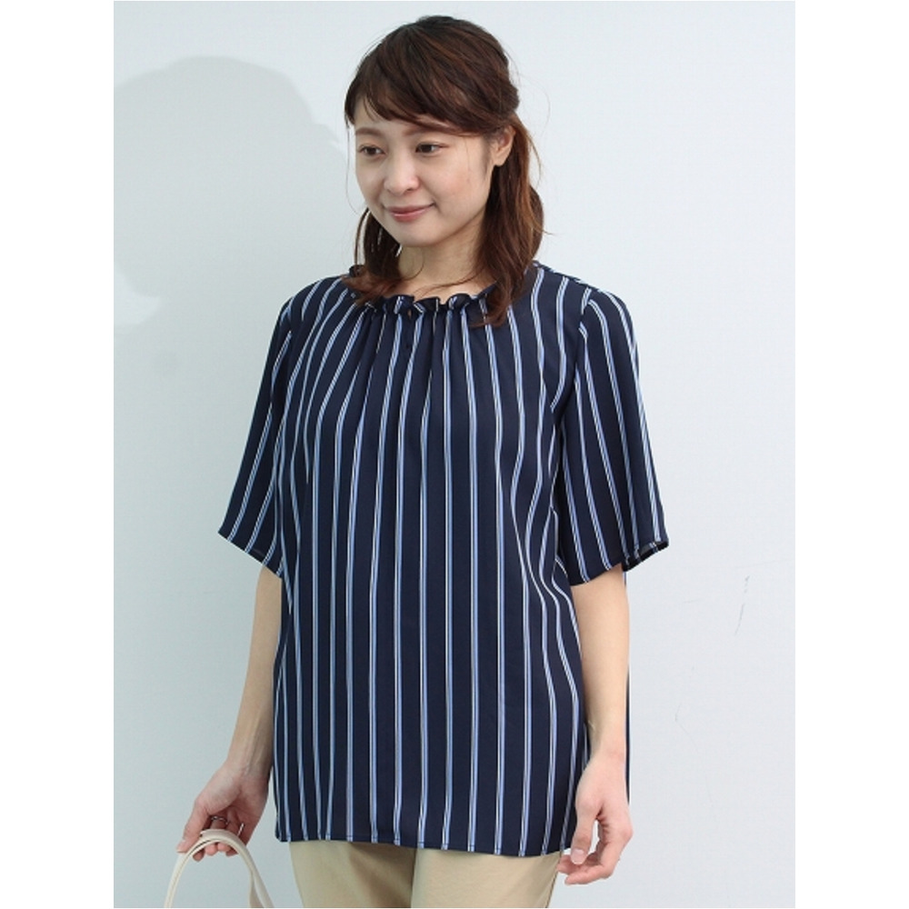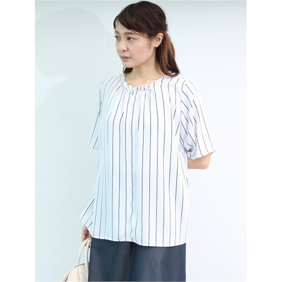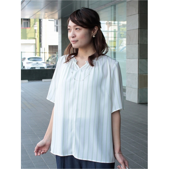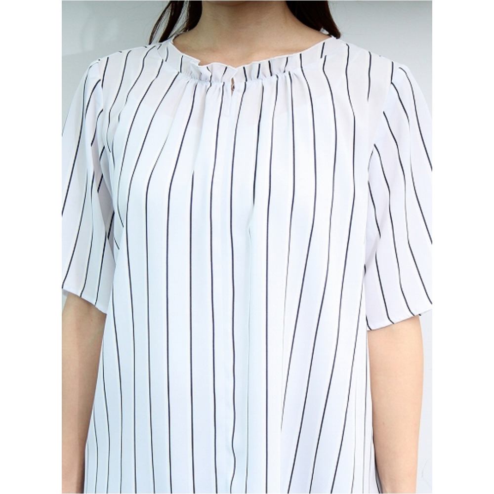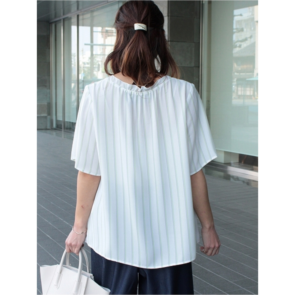 スッキリとしたストライプに襟ぐりのフリルで柔らかい雰囲気に。