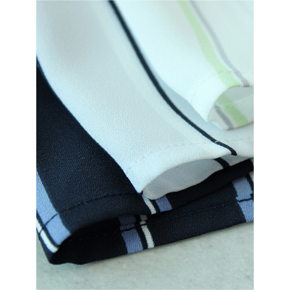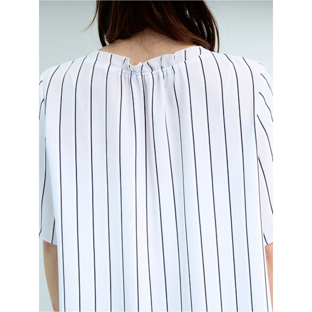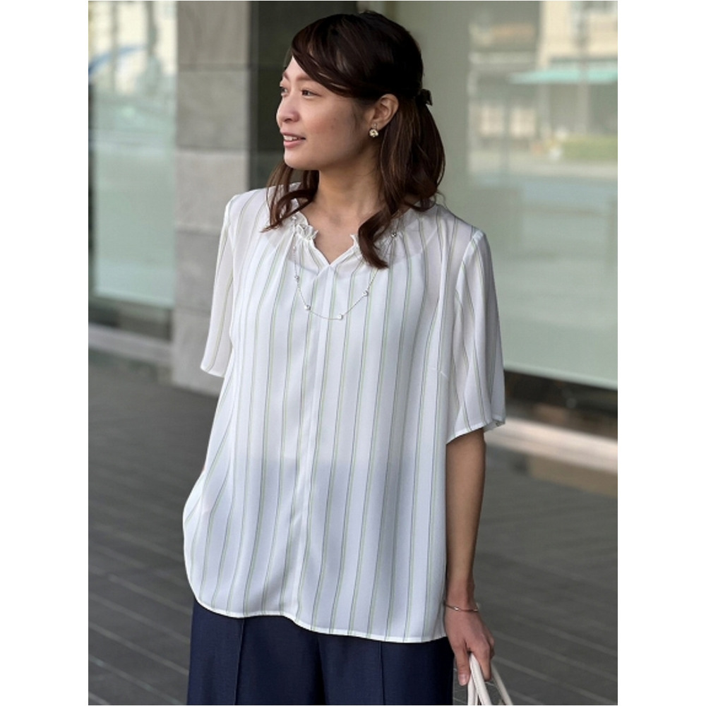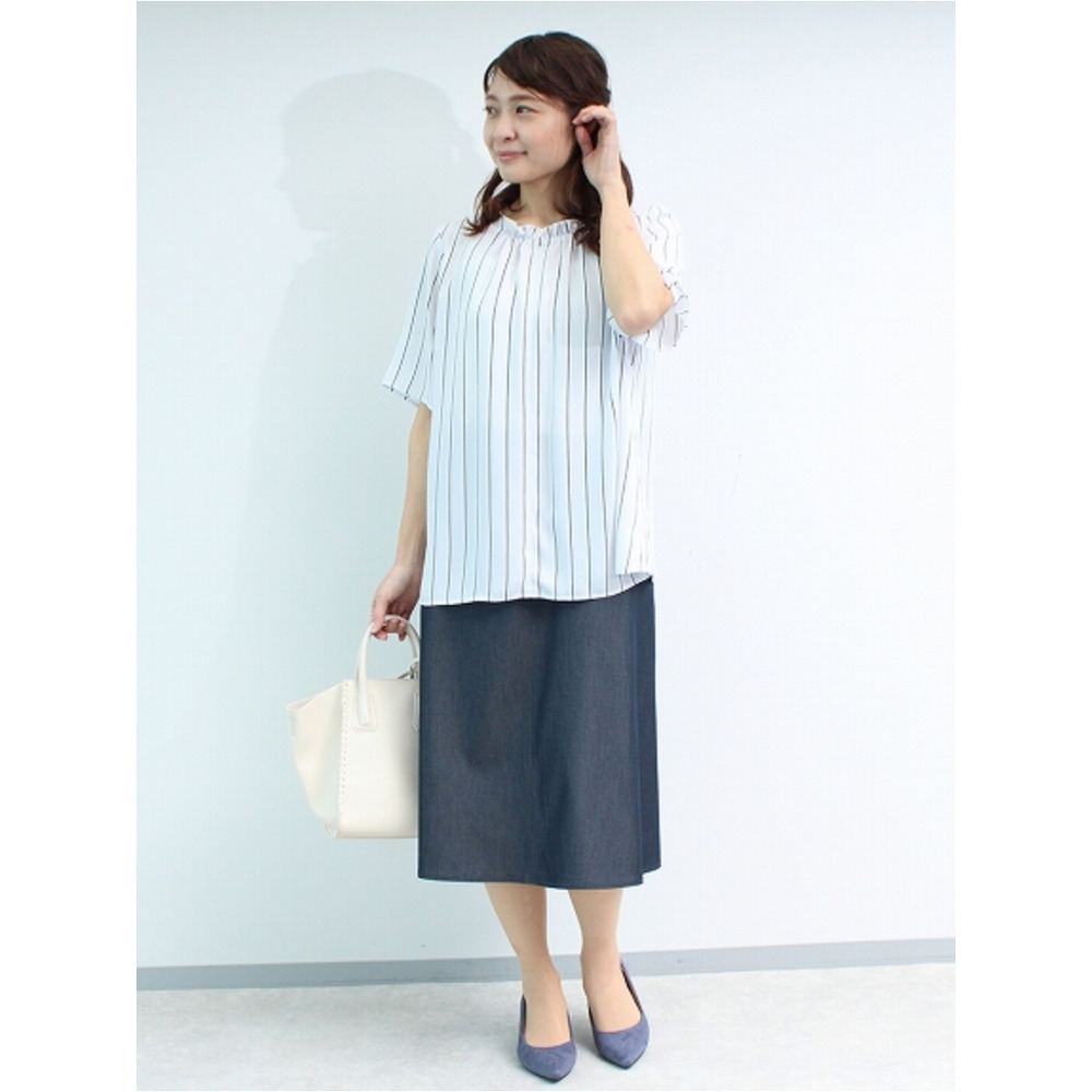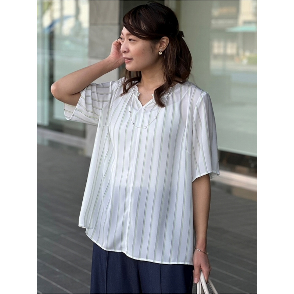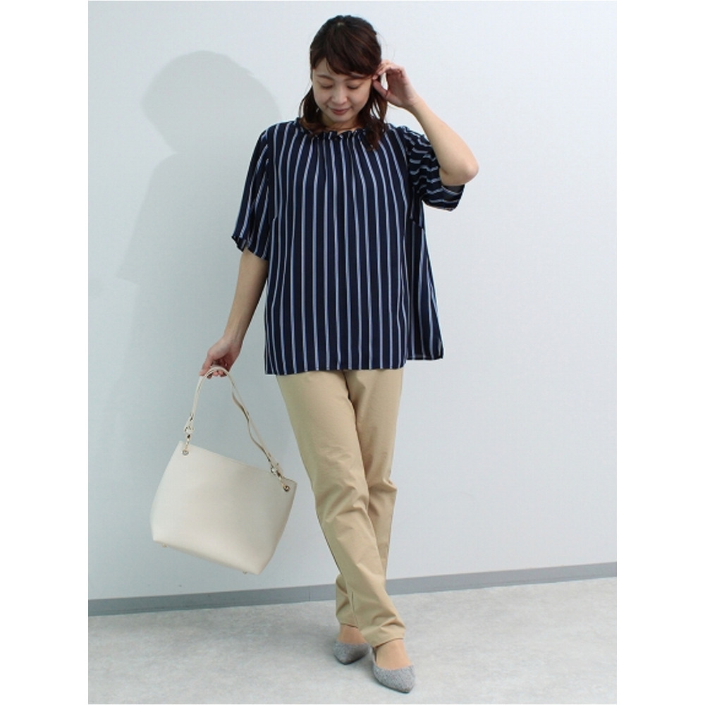 スッキリとしたストライプに襟ぐりのフリルで柔らかい雰囲気に。