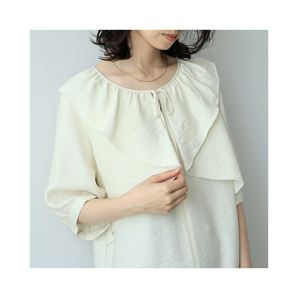 顔まわりを華やかに見せてくれる、大きめフリルが印象的なデザイン。