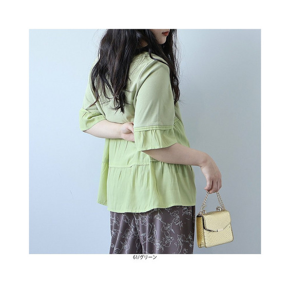 身頃はストレッチの効いたカットソー素材、袖と後ろフリルには軽やかな布帛素材を使用した異素材デザインで、立体感と動きのある仕上がりに。