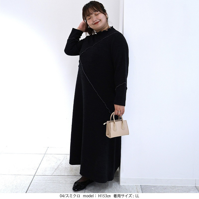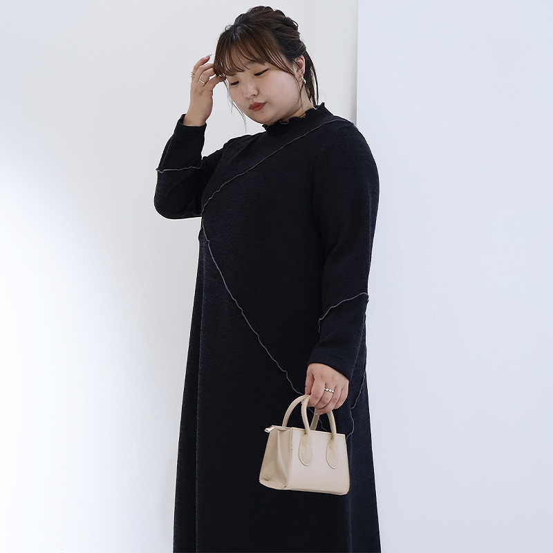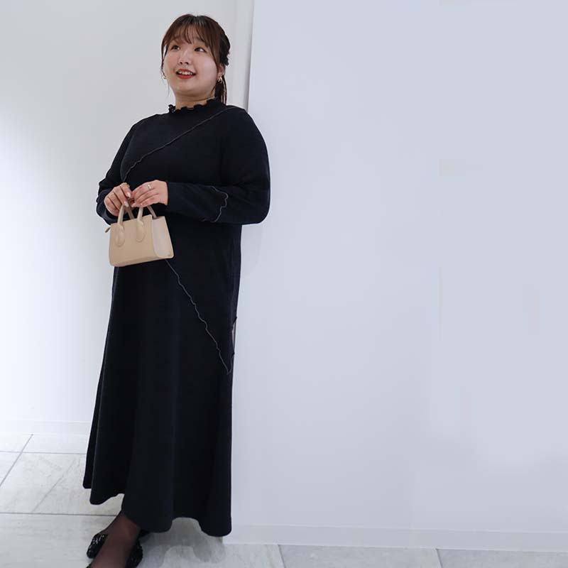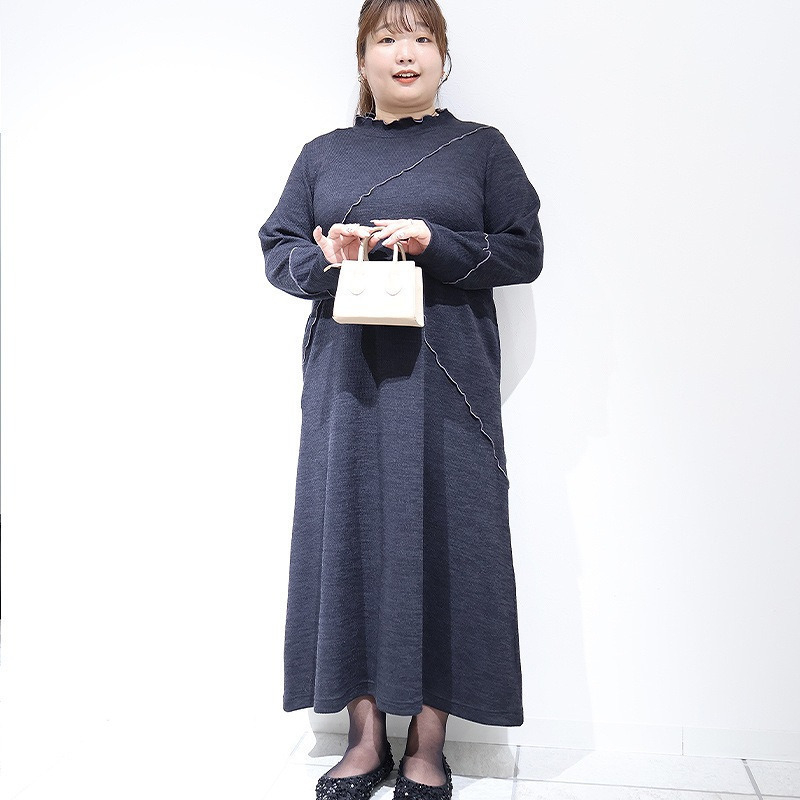 裾にほんのりフレアを入れた大人フェミニンなシルエットが優しく体を包み込み、女性らしい柔らかな印象に。