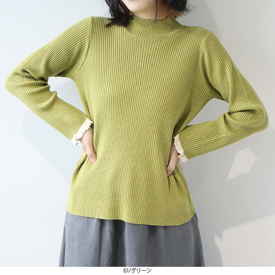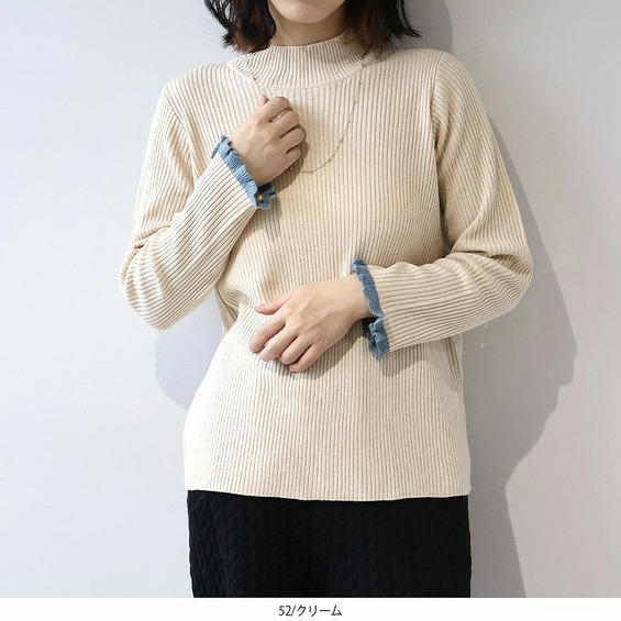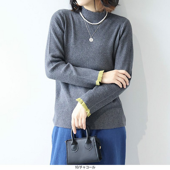 シンプルながら、袖口のバイカラーがさりげないアクセントになる万能リブニットプルオーバー。