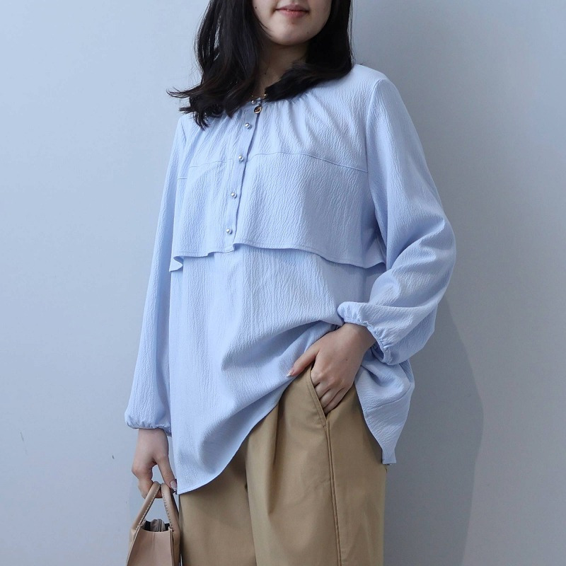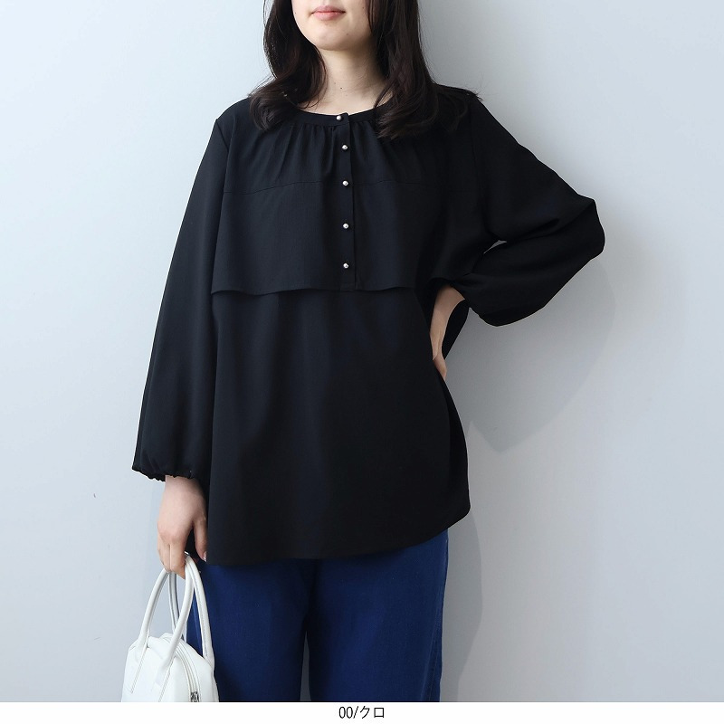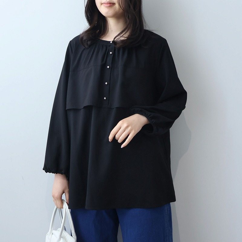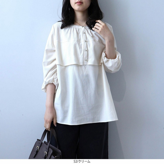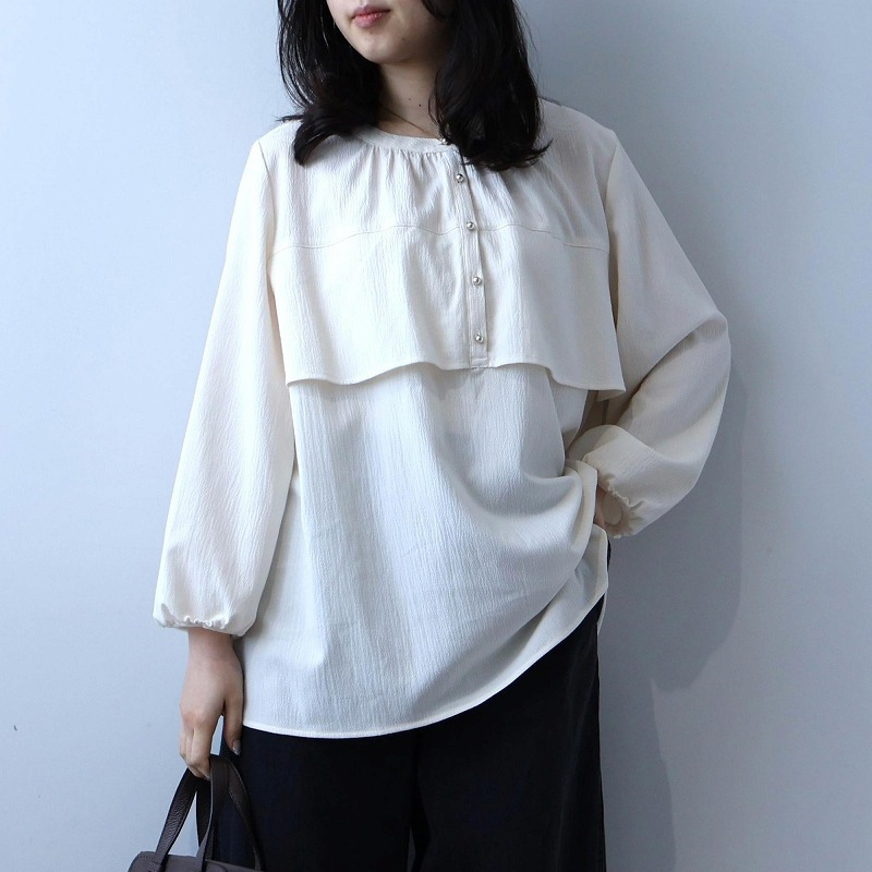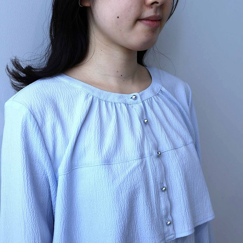 ドライタッチな素材とパールボタンが可愛い。着るだけで華やぐ胸元フリルブラウス。