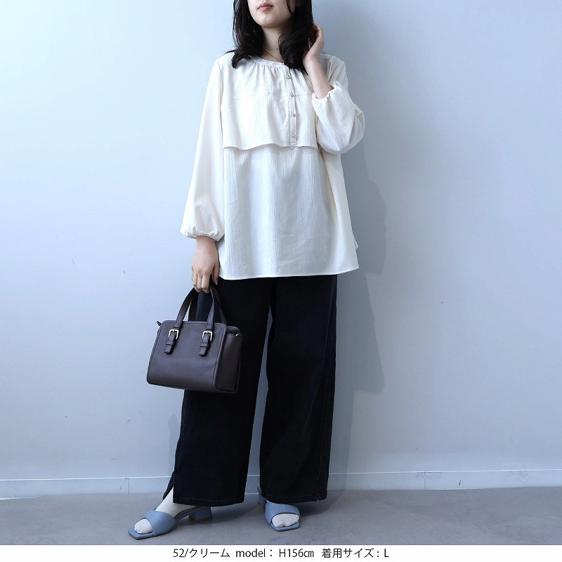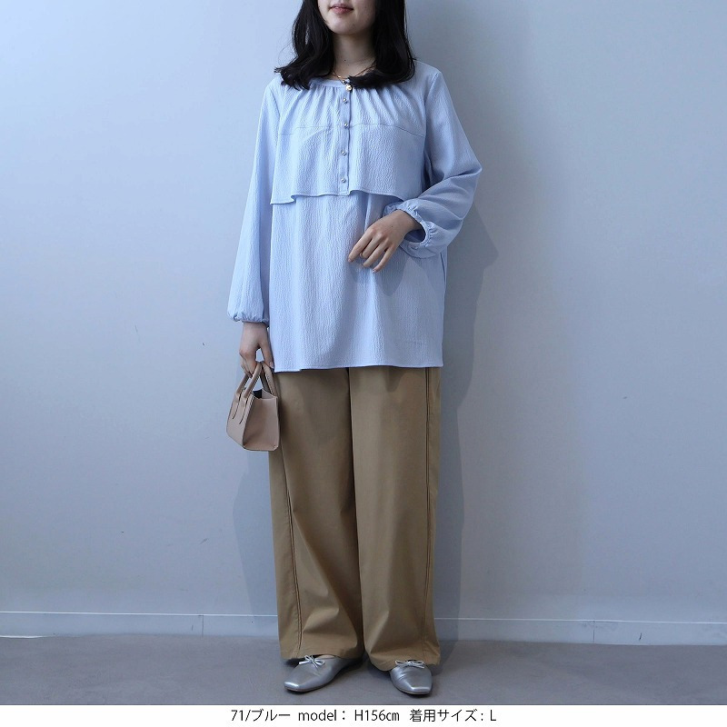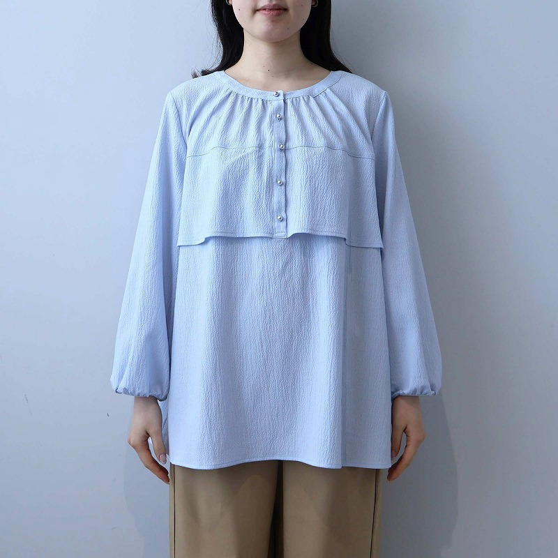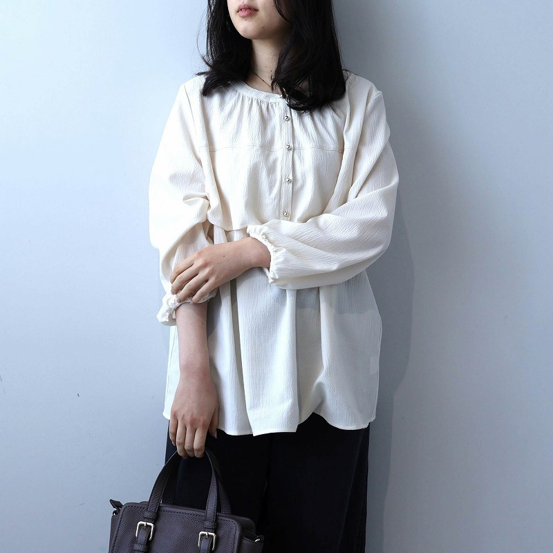 ボリュームのあるプリーツスカートや落ち感のあるガウチョパンツと合わせ、ブラウスのポコポコした素材感を活かすことでリラックス感がありながらも洗練されたカジュアルスタイルに仕上がります。