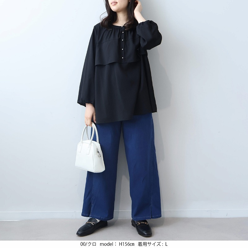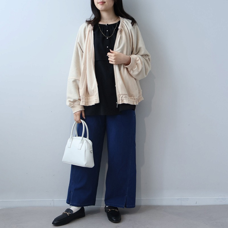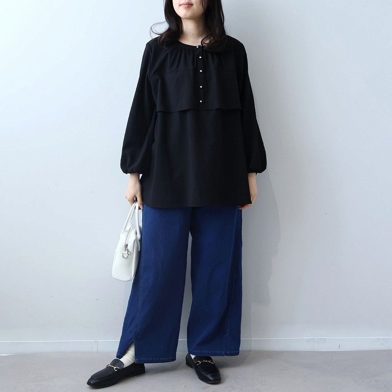 カジュアルな素材感ながらフリルとパールボタンが相まって、甘すぎない大人のフェミニンカジュアルを演出します。