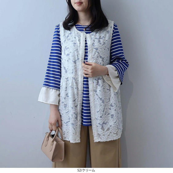 ロング丈のブラウスやシャツをインナーに、裾から覗かせて着用いただくと、チュニック丈のジレと縦のラインが強調され、体型を気にせずゆったりとフェミニンな着こなしが楽しめます。