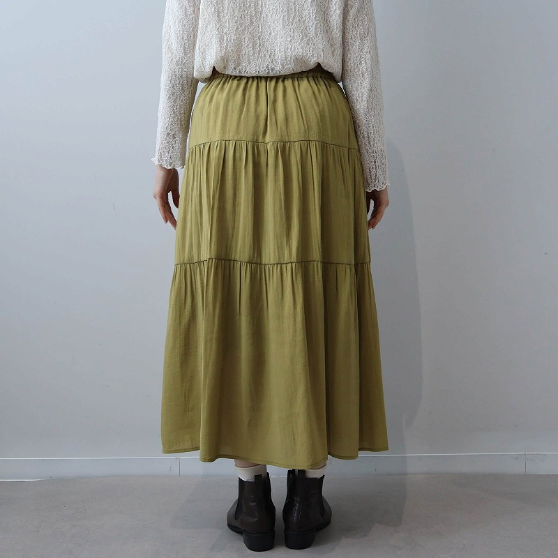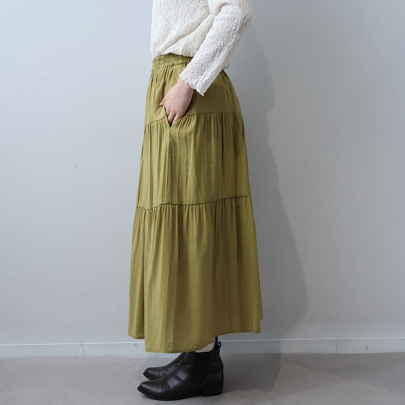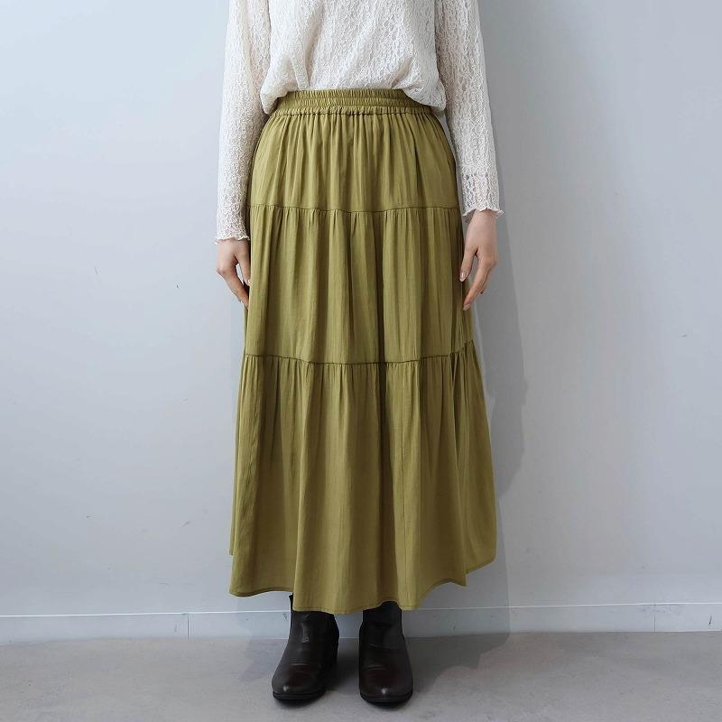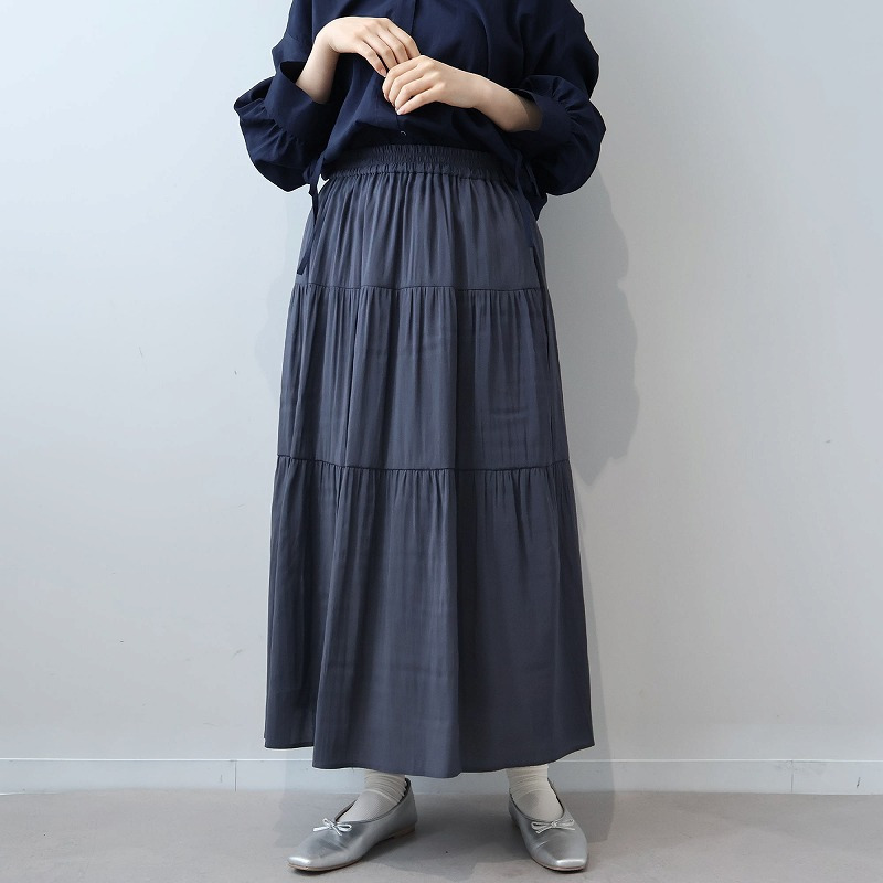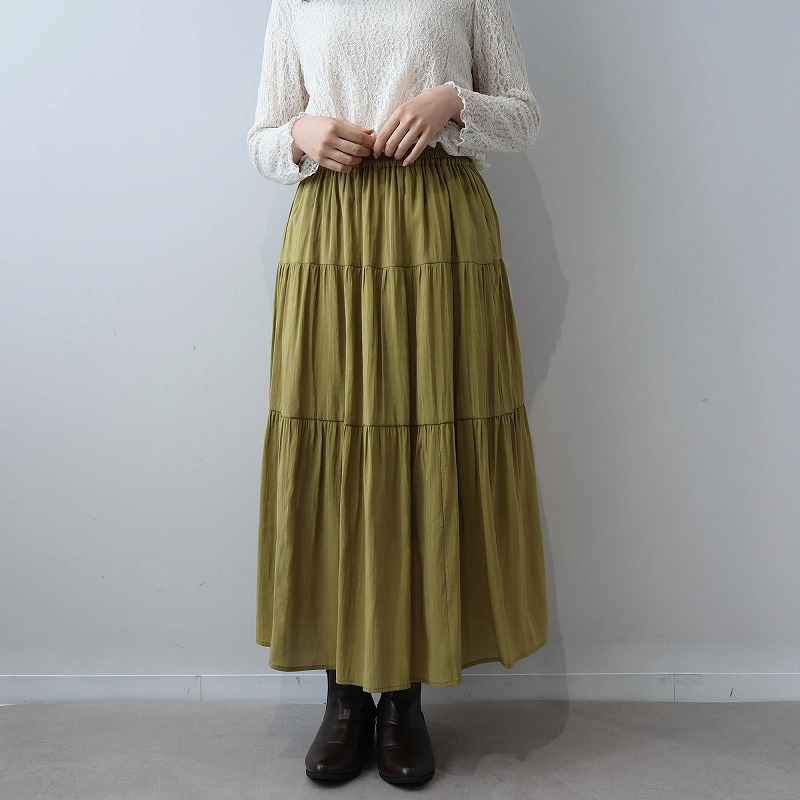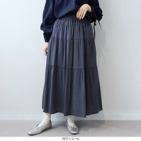 大人かわいい雰囲気を演出する、エレガントなロング丈の3段ティアードスカートです。