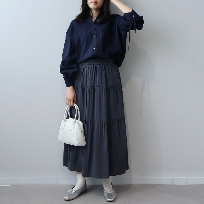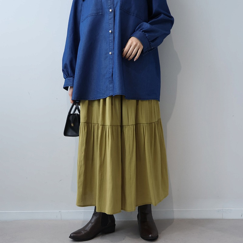 キレイめなシャツやブラウスまたはショート丈カーディガンと合わせると、ウエスト総ゴムでリラックス感がありながら上品なフェミニンカジュアルが楽しめます。