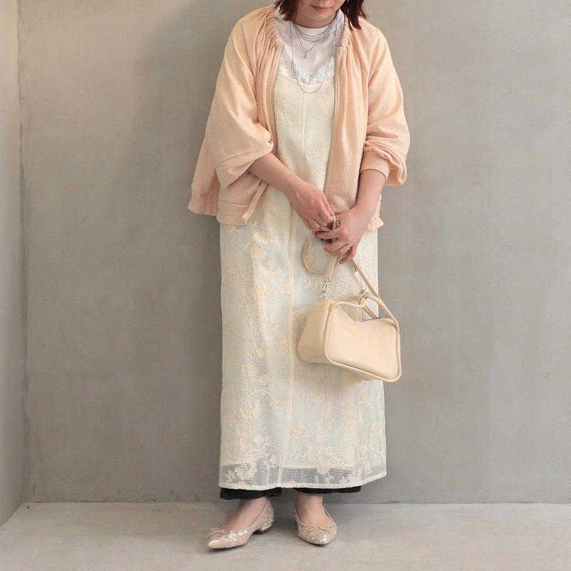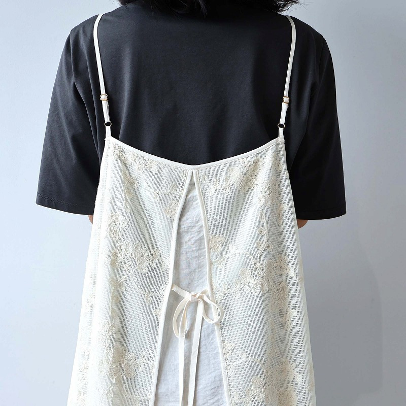 ショート丈カーディガンなど、短めのトップスやジャケットを上から羽織って頂くと、バックシャンなリボンとレースの裾のディテールが際立ち、上品なスタイルが楽しめる1枚です。