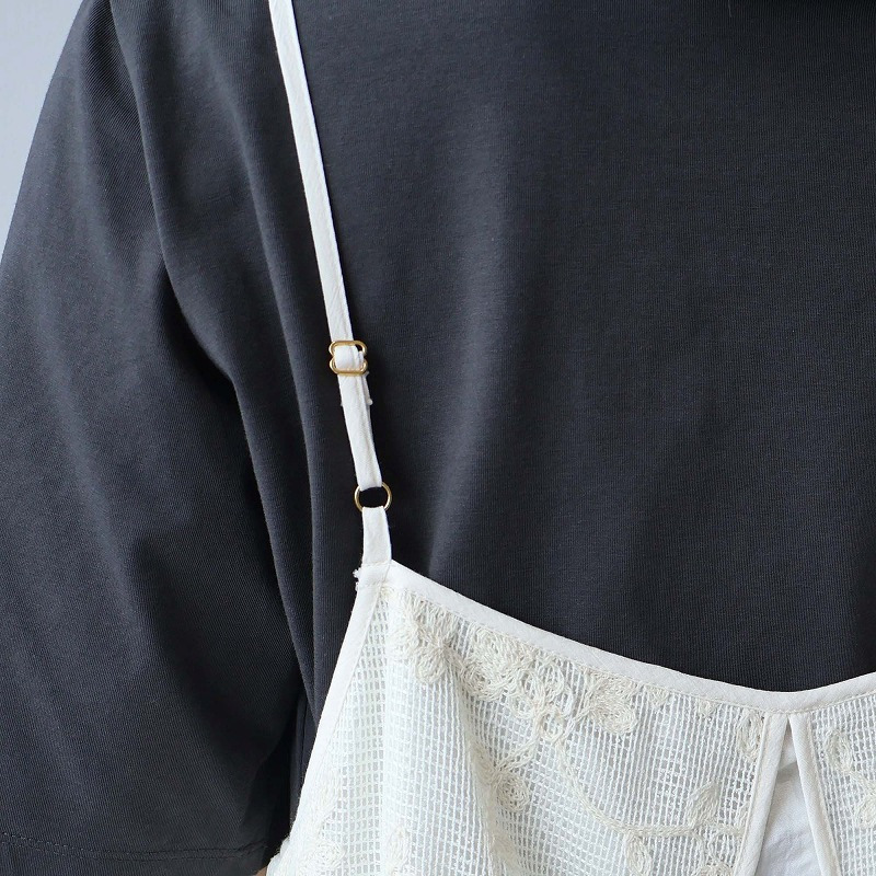 肩ストラップはアジャスター付きで、着丈や胸元の開き具合を調整可能です。