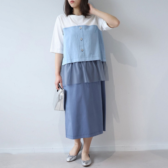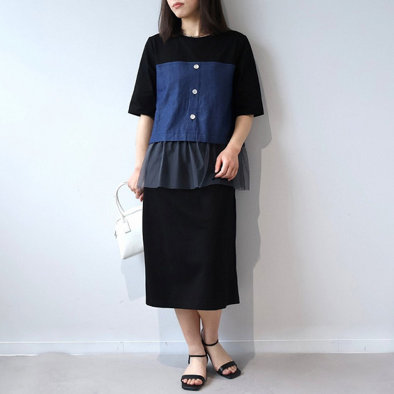 | 素材 | 本体:綿74%、ポリエステル26% 衿部分:綿56%、ポリエステル44% デニム部分:綿100% チュール部分:ポリエステル100% |