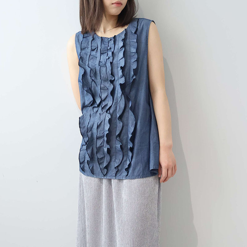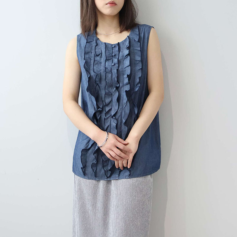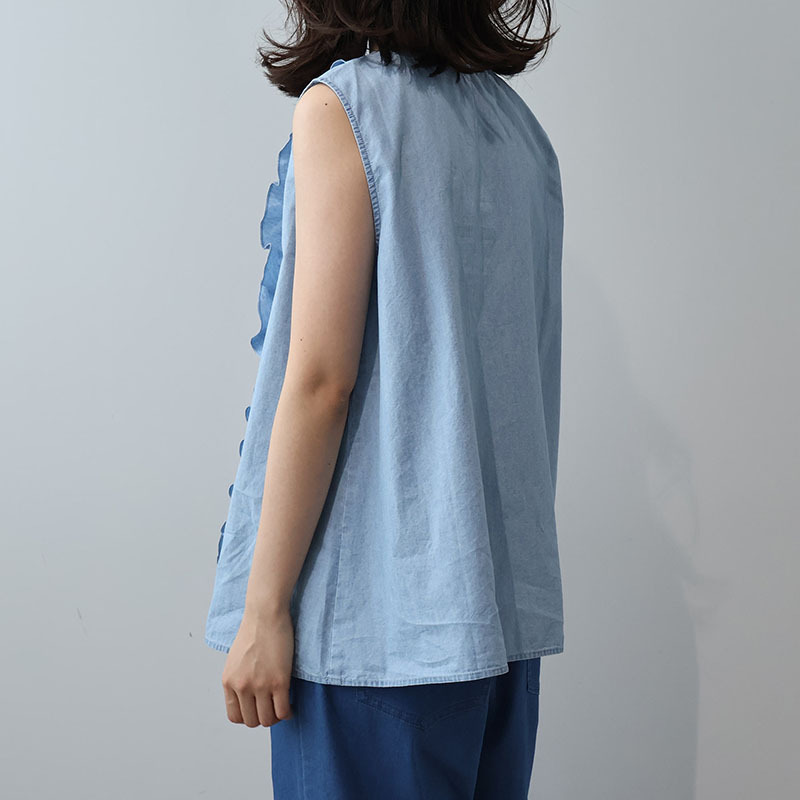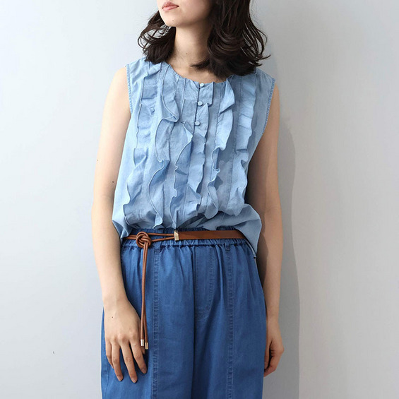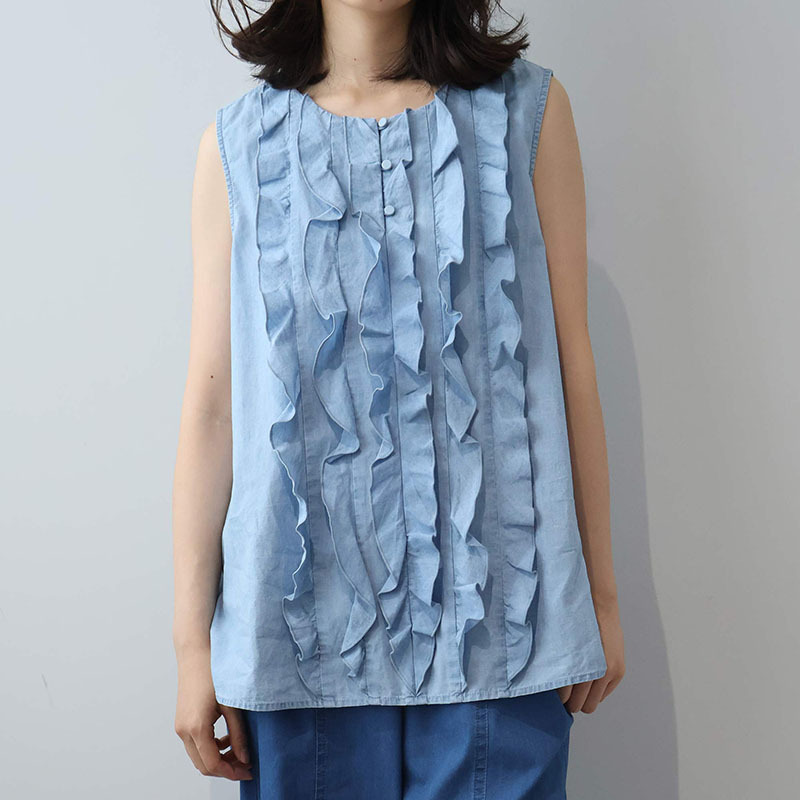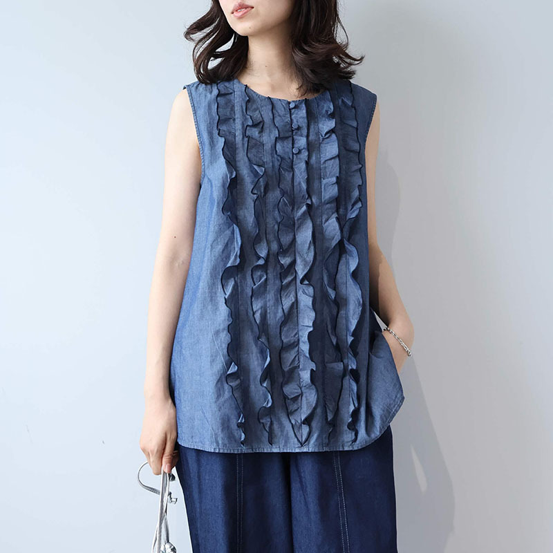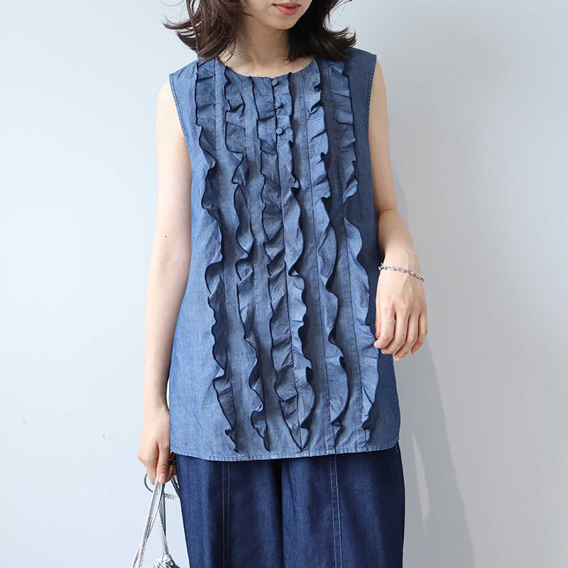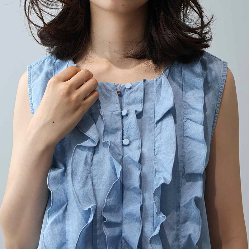 フロントに贅沢にあしらわれたフリルディテールが、パッと目を引く主役級のノースリーブブラウスです。