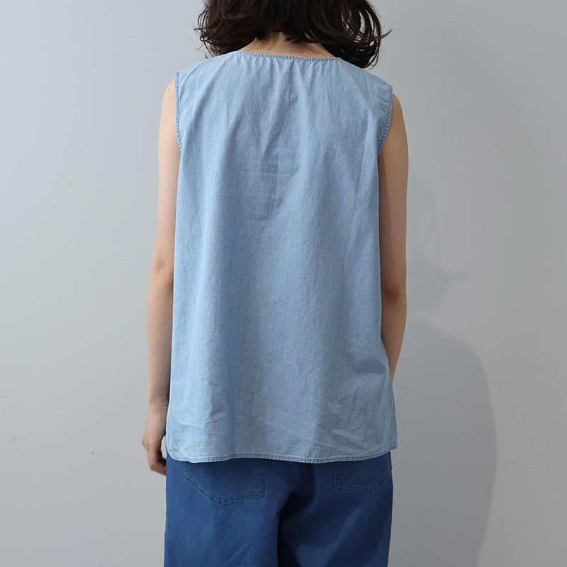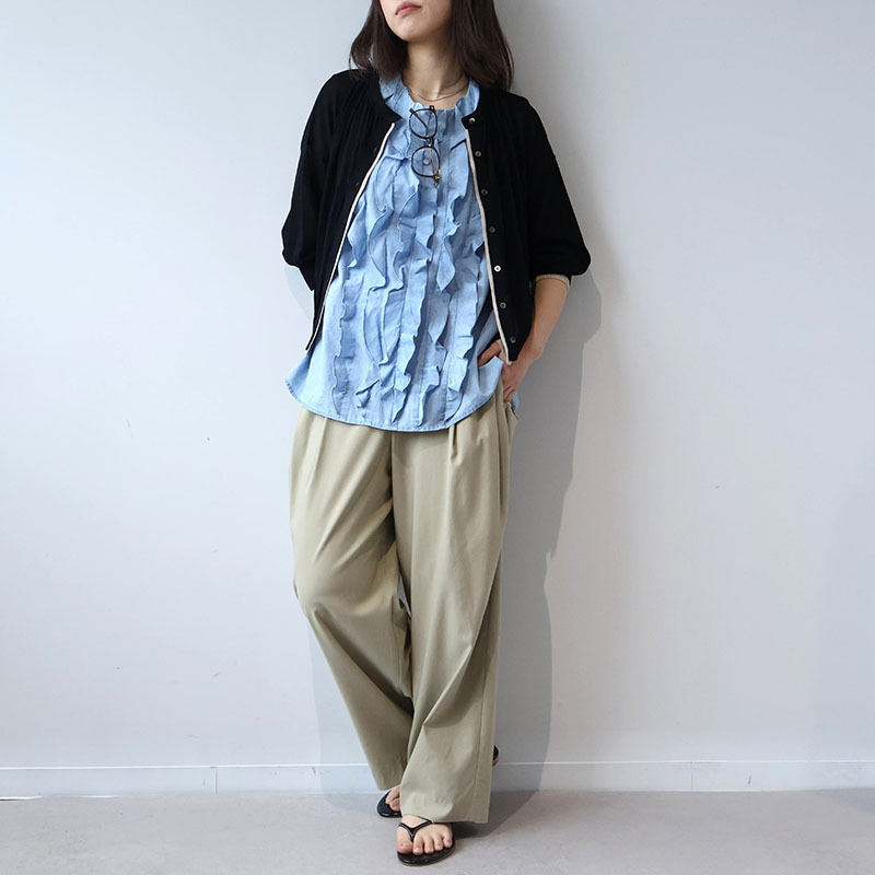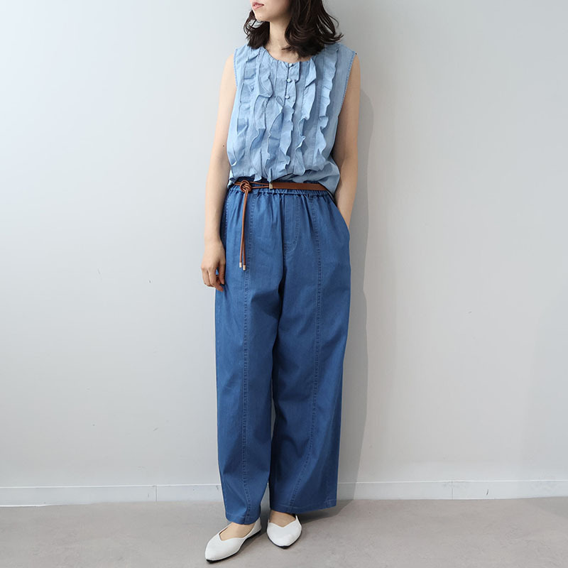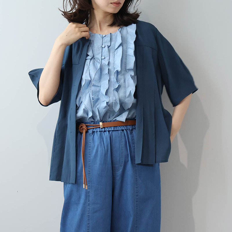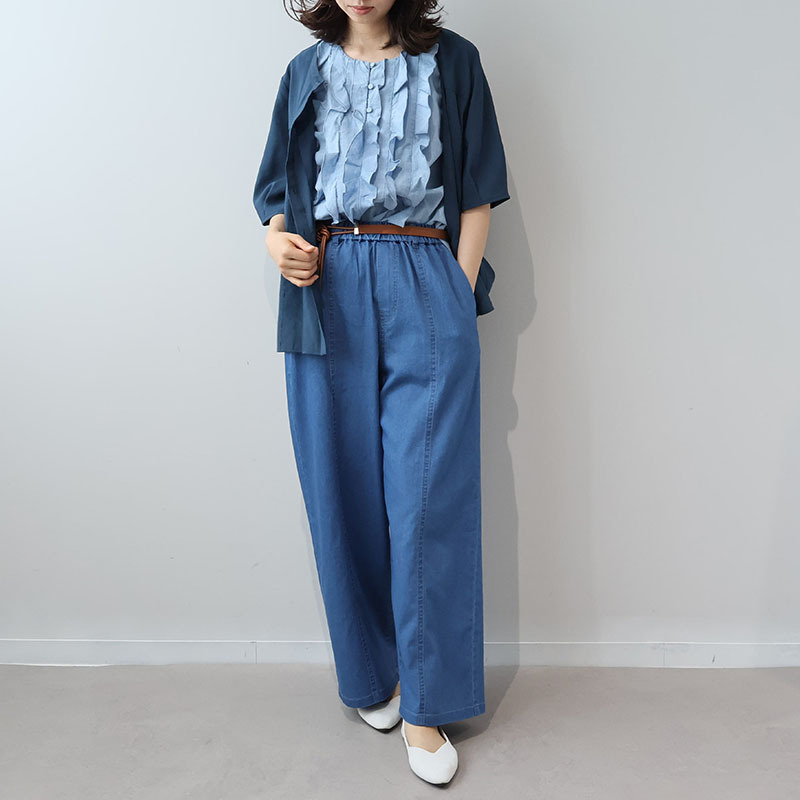 デニム特有のしっかりとした表情がありつつも、薄手なのでさらりと涼しく、真夏でも快適な着心地です。