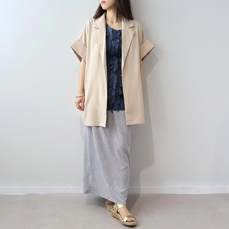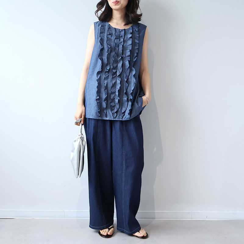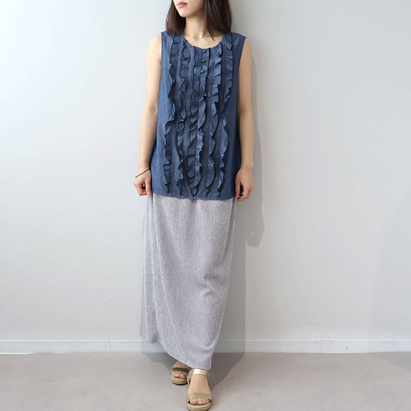 ノースリーブの涼しげなシルエットが、肩周りを華奢に見せつつ、計算されたフリルのボリュームが全身のバランスを整えてくれます。