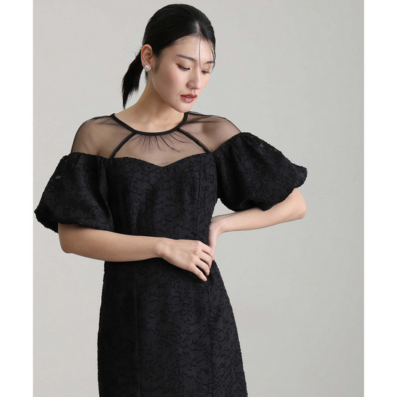 繊細な透け感のデコルテと、華やかなパフスリーブが印象を引き立てます。