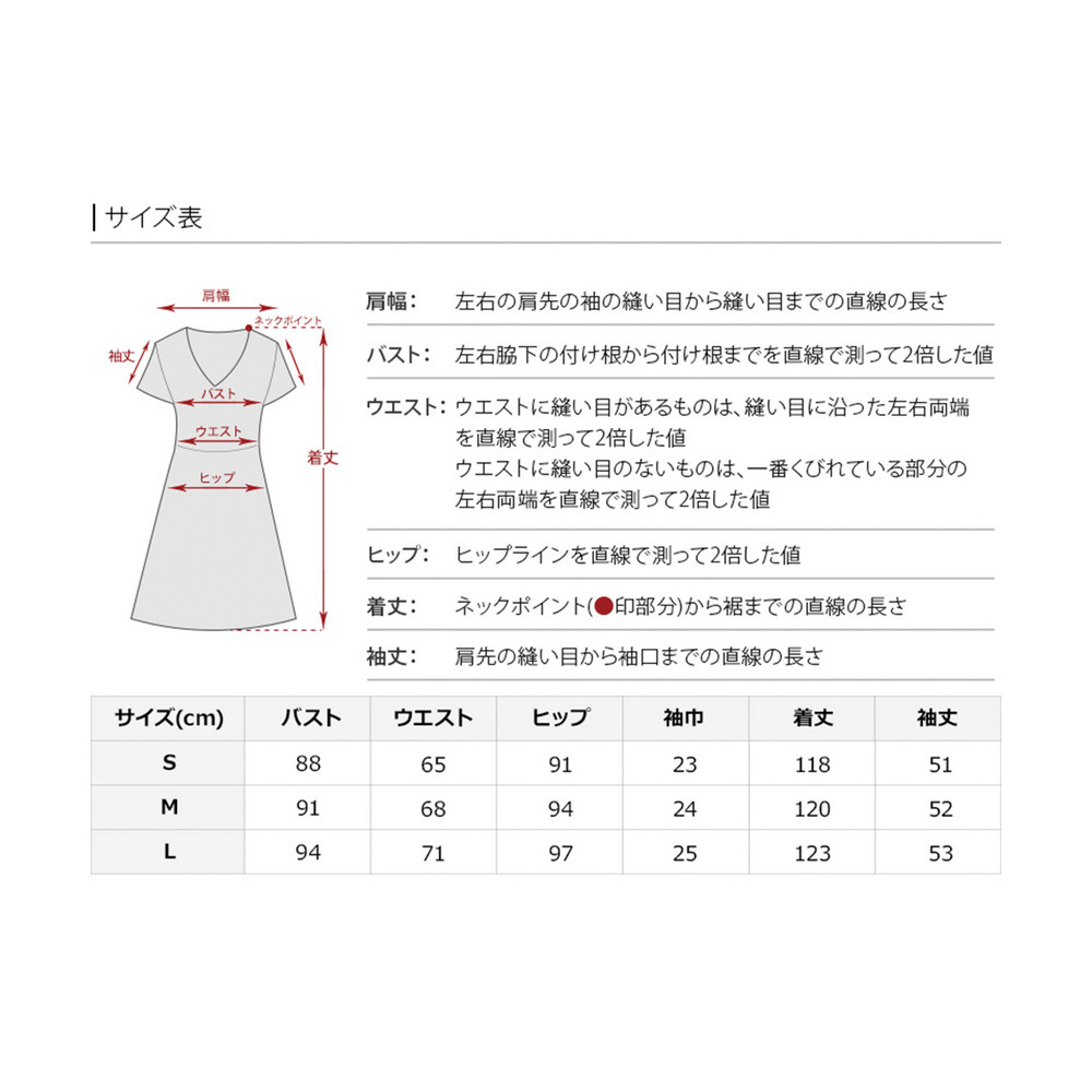 サイズ表記 L バスト 94cm ウエスト 71cm ヒップ 97cm 袖巾 25cm 着丈 123cm 袖丈 53cm