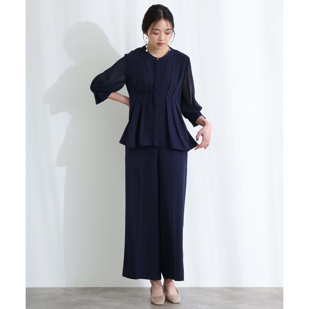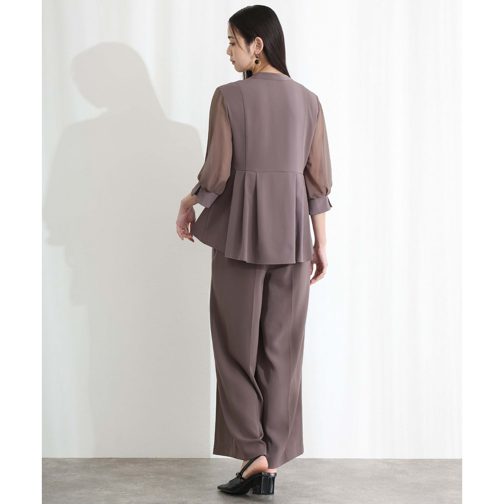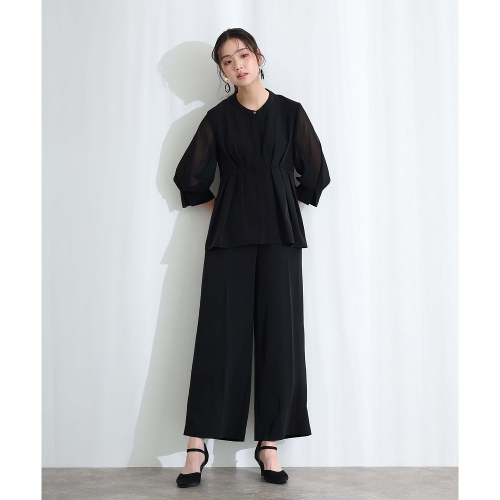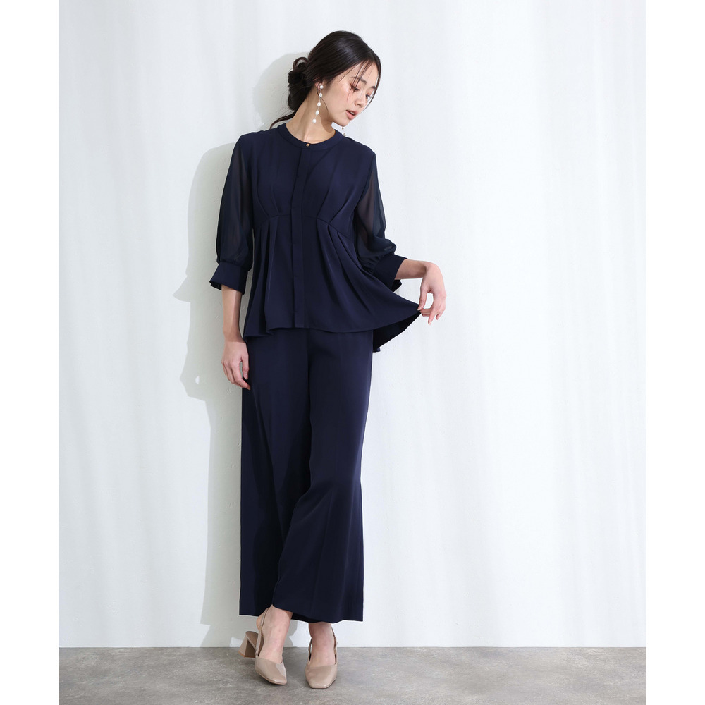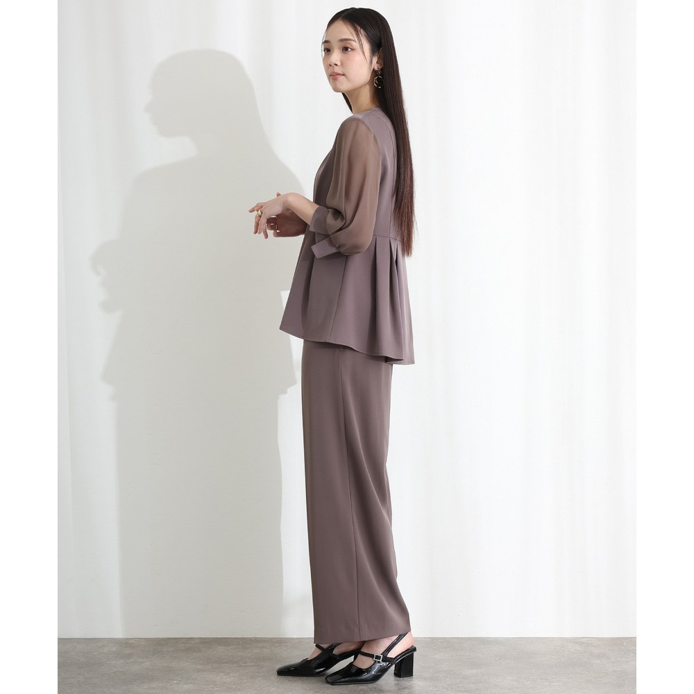 エレガントなペプラムトップスとワイドパンツの2点セット。