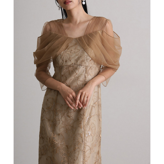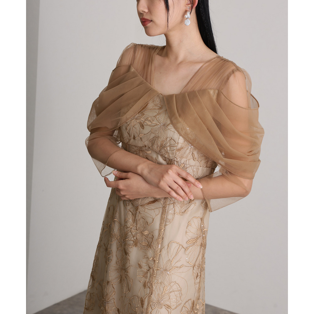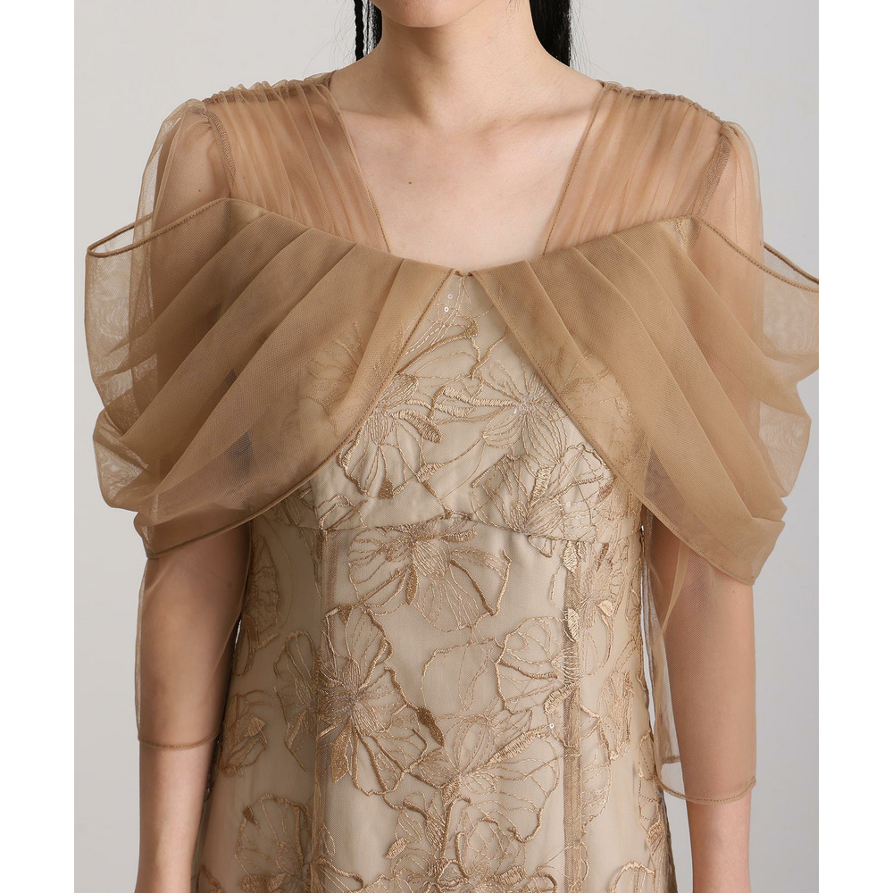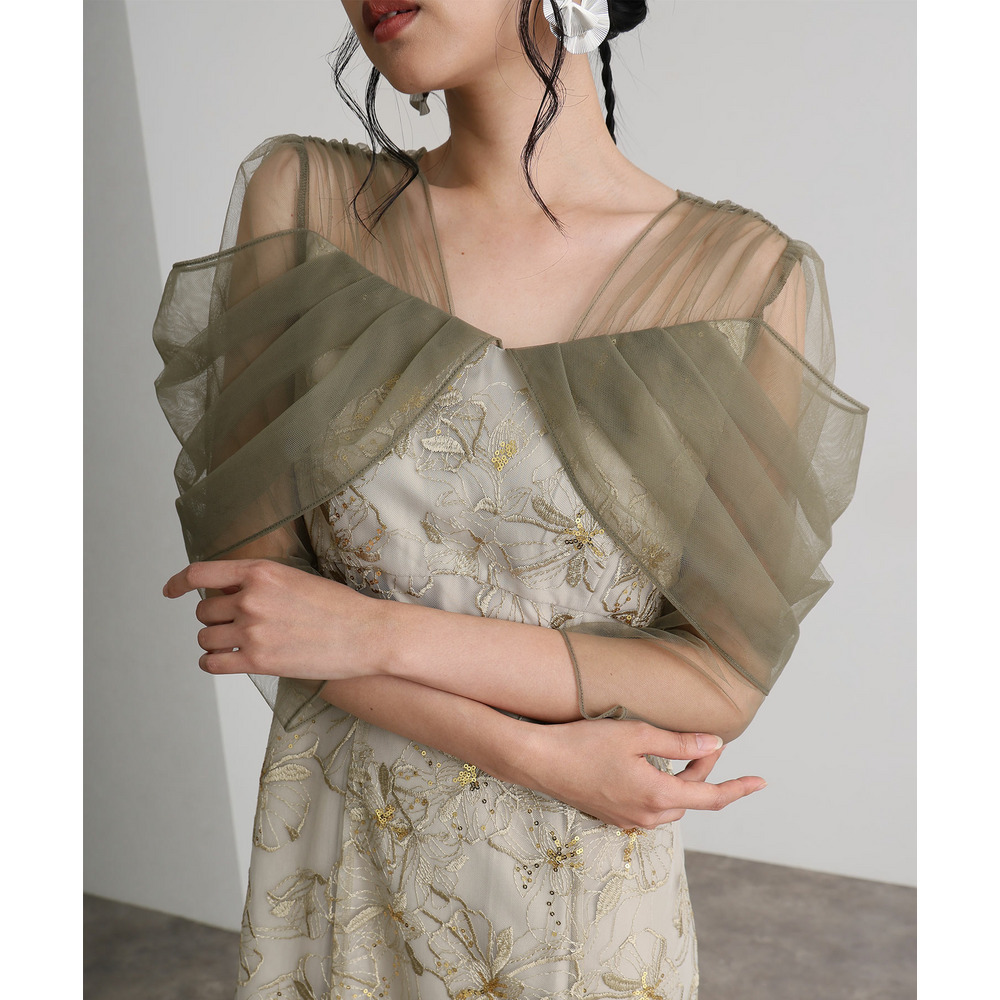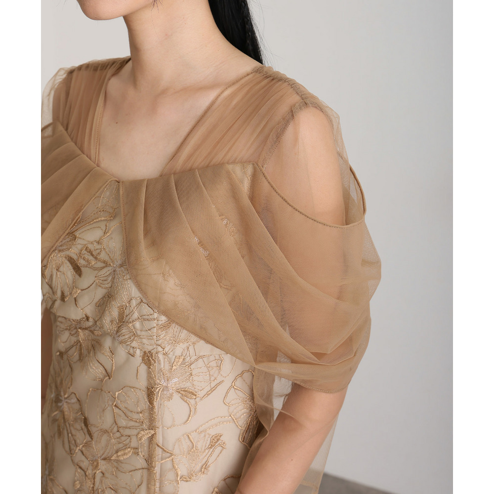 肩周りやお袖にかけて、美しい透け感のあるチュール素材を使用。