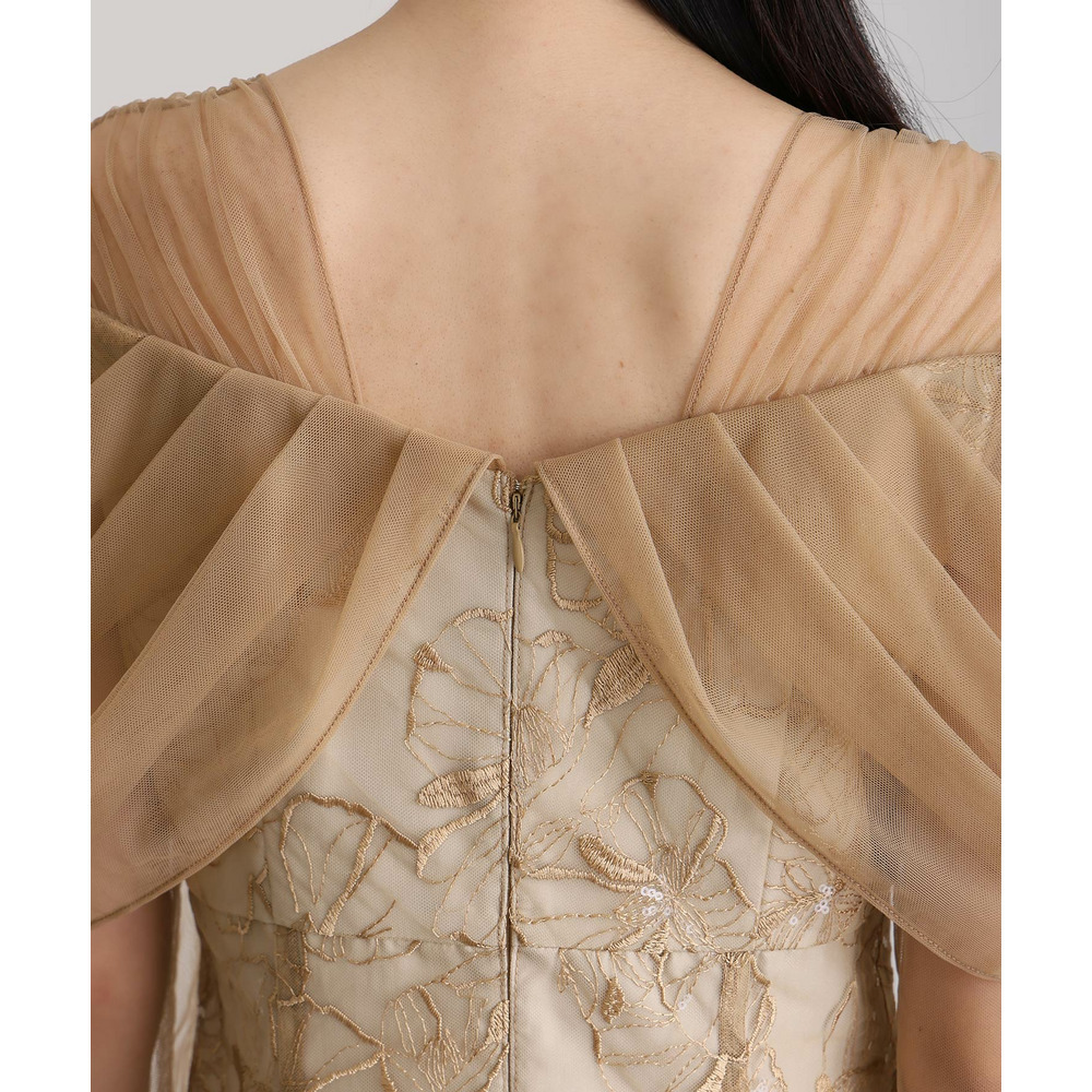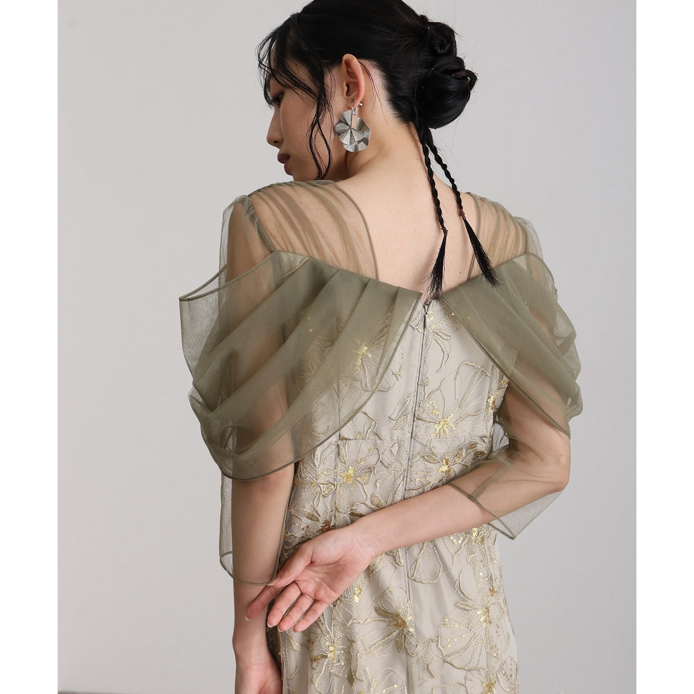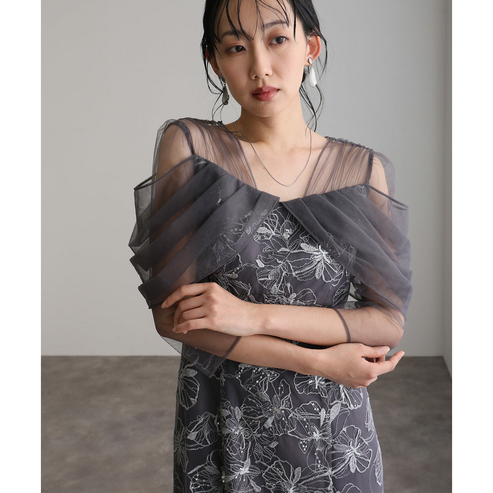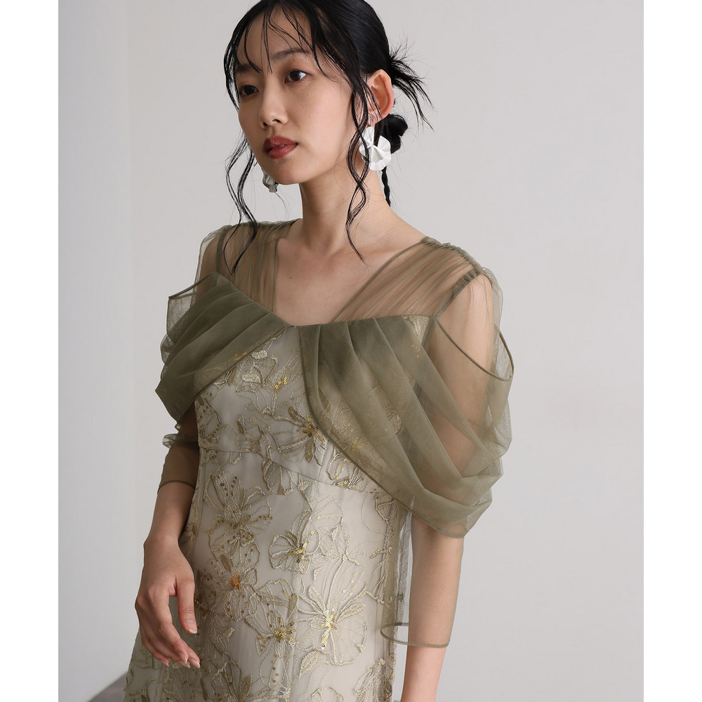 肩周りやお袖にかけて、美しい透け感のあるチュール素材を使用。