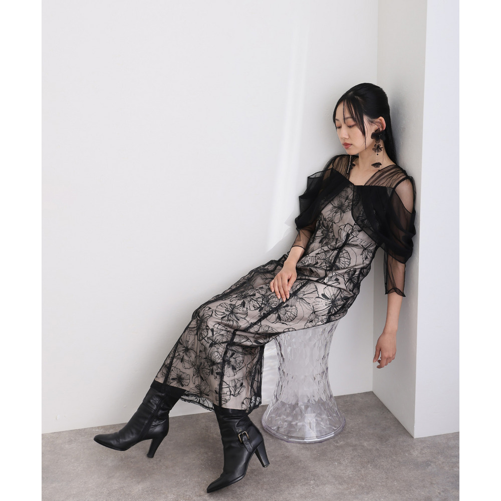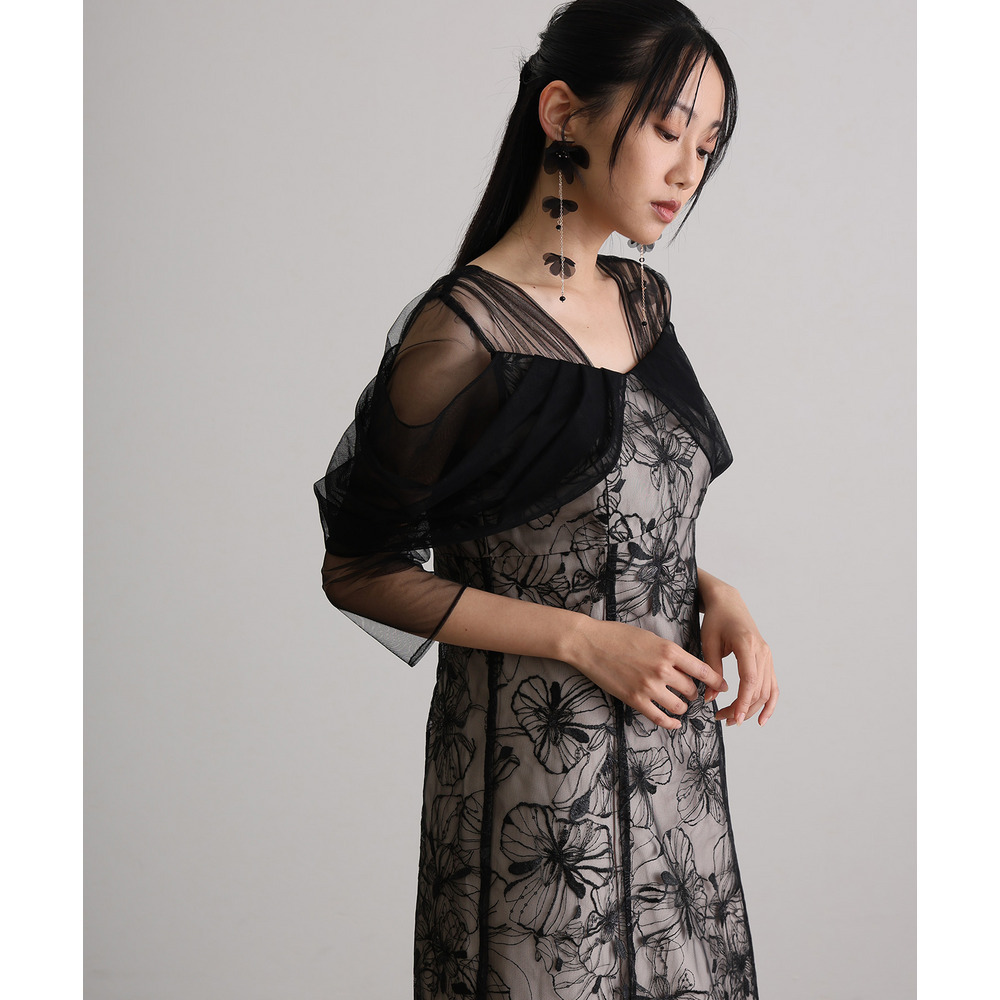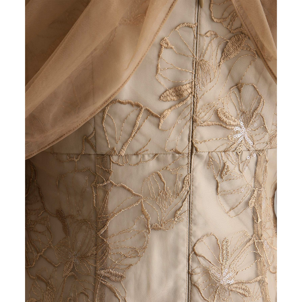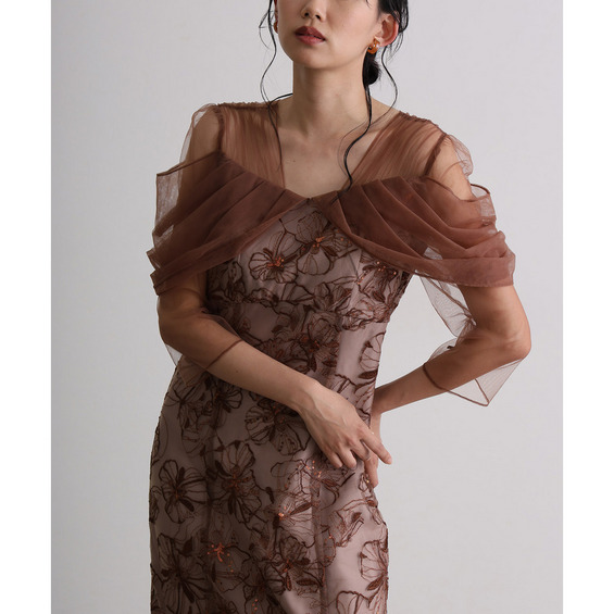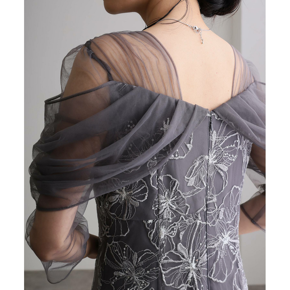 肩周りやお袖にかけて、美しい透け感のあるチュール素材を使用。