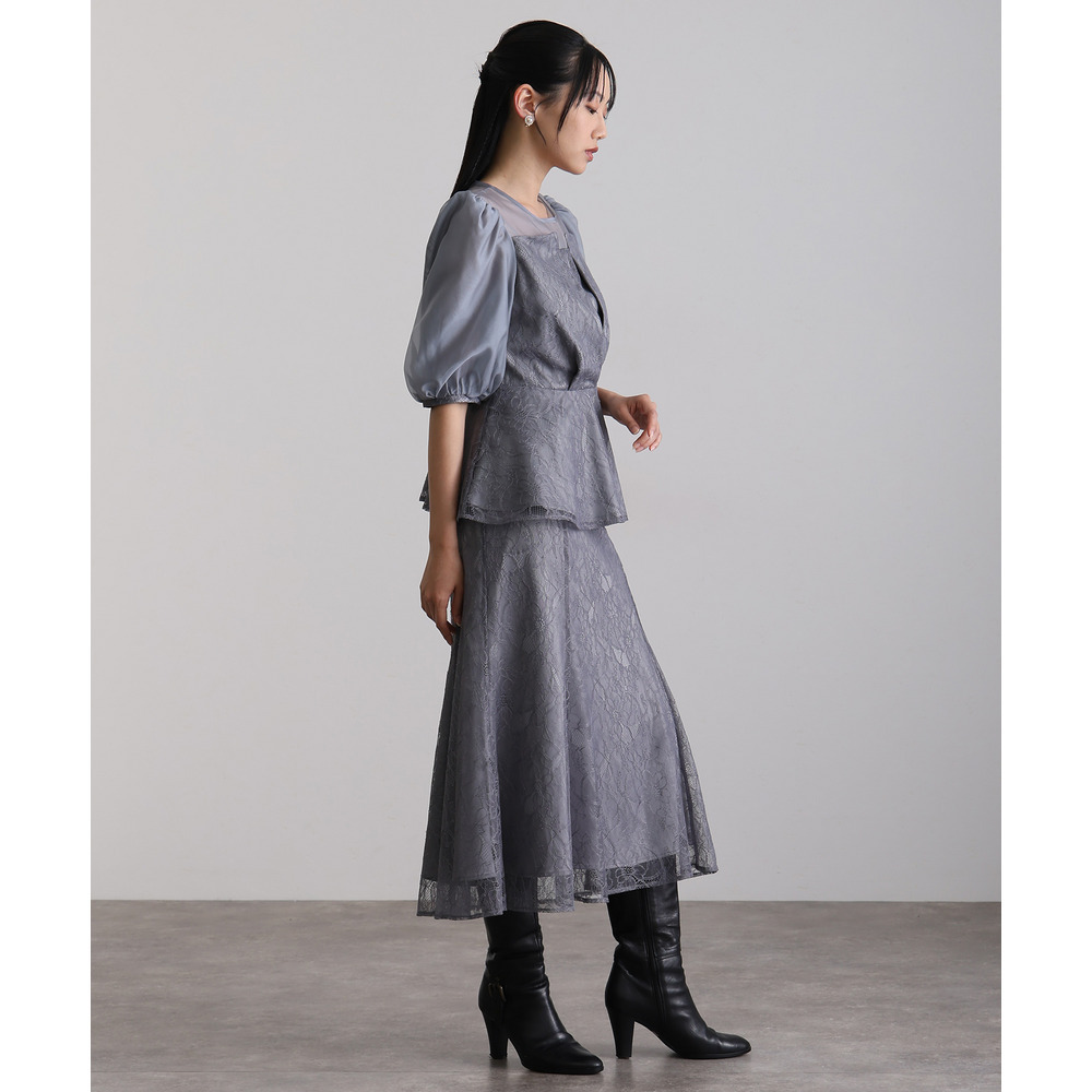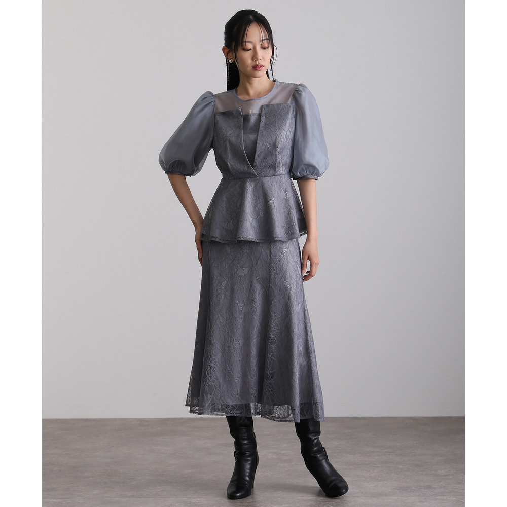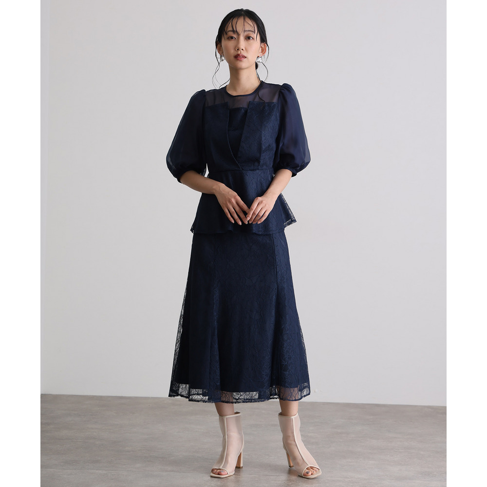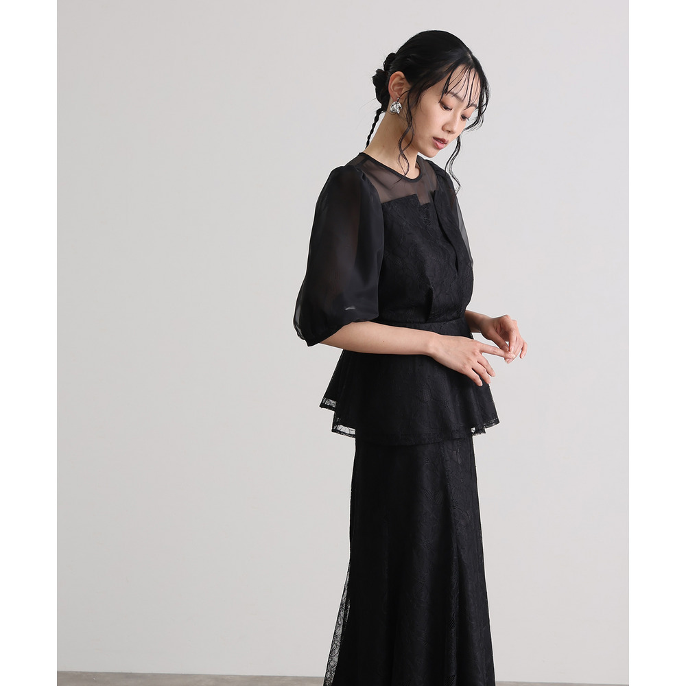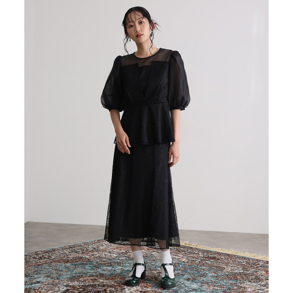 素材 | 【トップス】 レース:ポリエルテル100% オーガンジー:ポリエステル100% 裏地:ポリエステル95% ポリウレタン5% 【スカート】 レース:ポリエルテル100% 裏地:ポリエステル95% ポリウレタン5% |