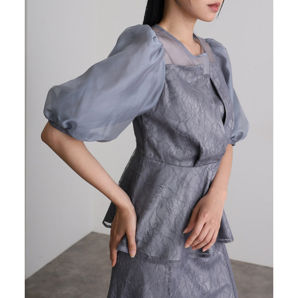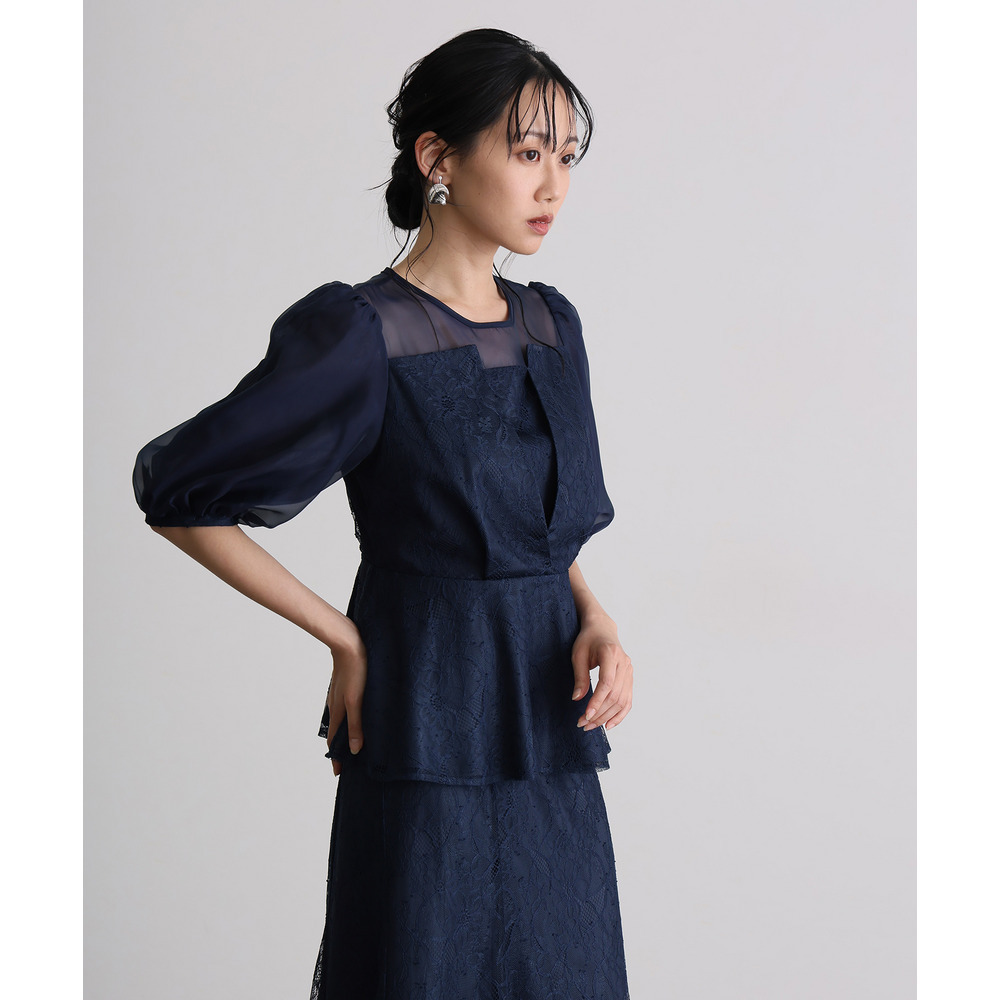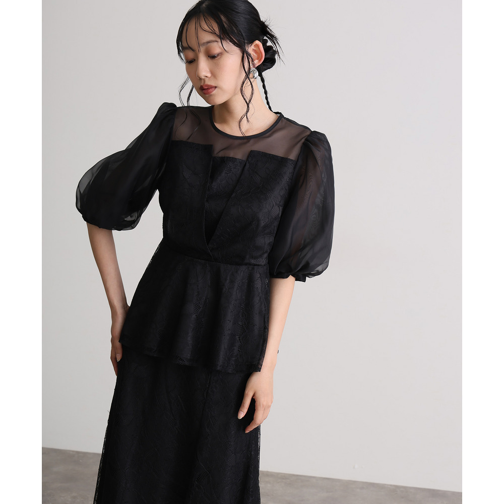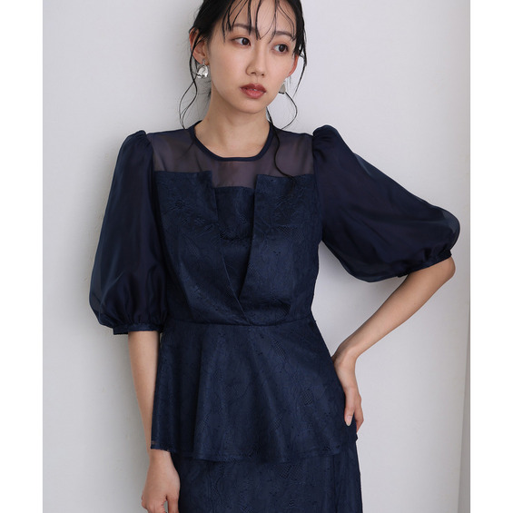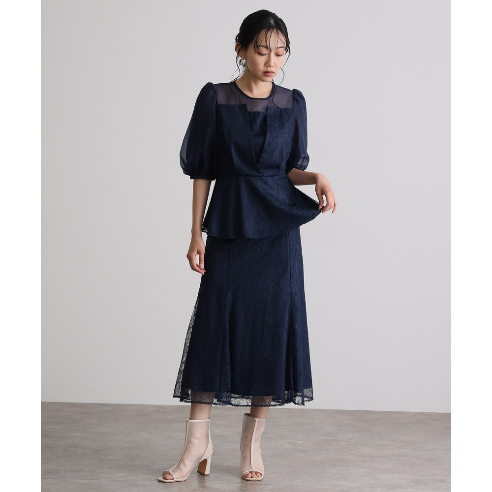 素材 | 【トップス】 レース:ポリエルテル100% オーガンジー:ポリエステル100% 裏地:ポリエステル95% ポリウレタン5% 【スカート】 レース:ポリエルテル100% 裏地:ポリエステル95% ポリウレタン5% |
