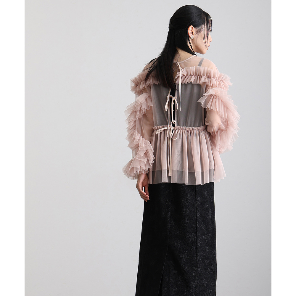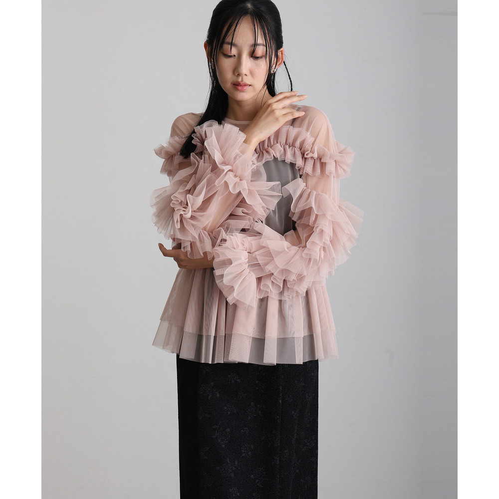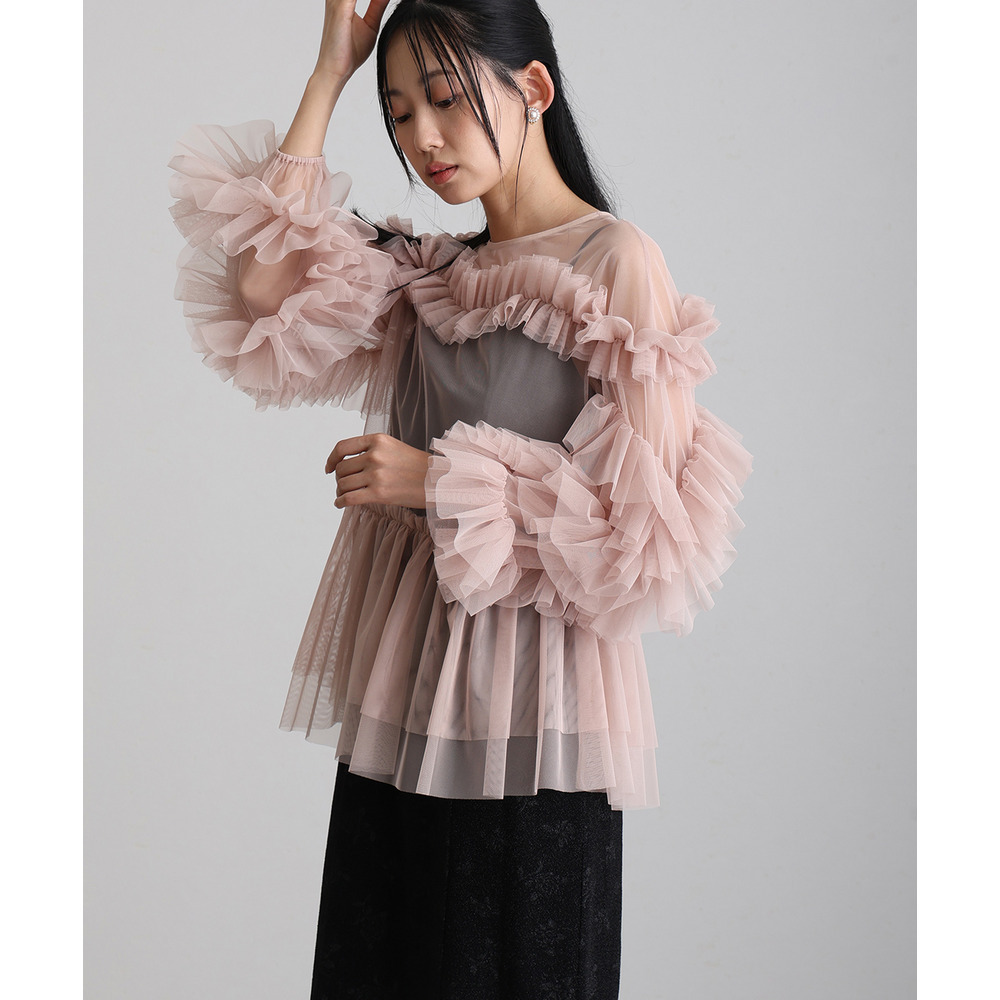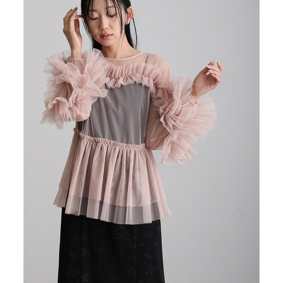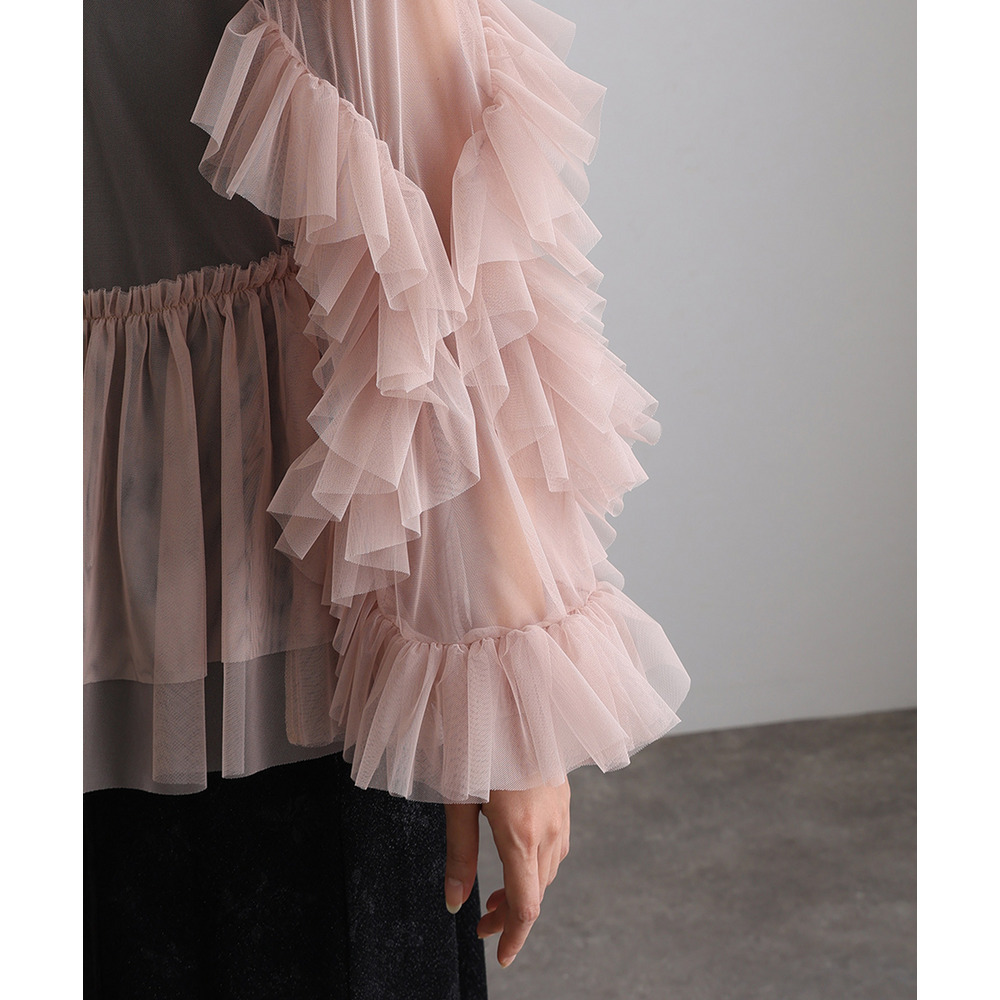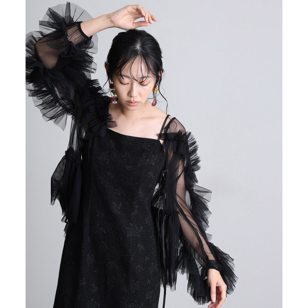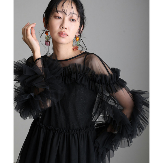 柔らかな透け感チュールに重ねられたフリルが華やかさをプラス
