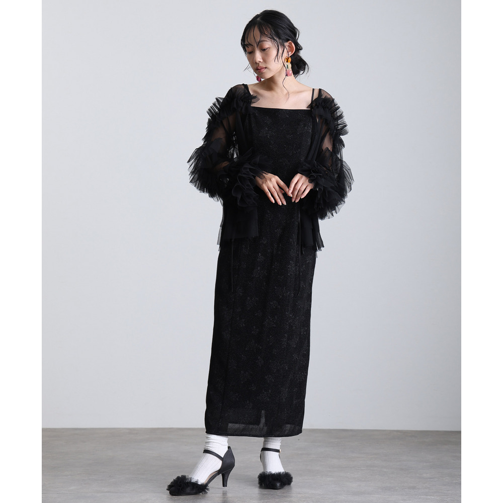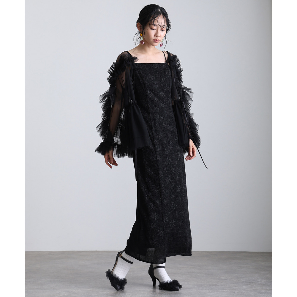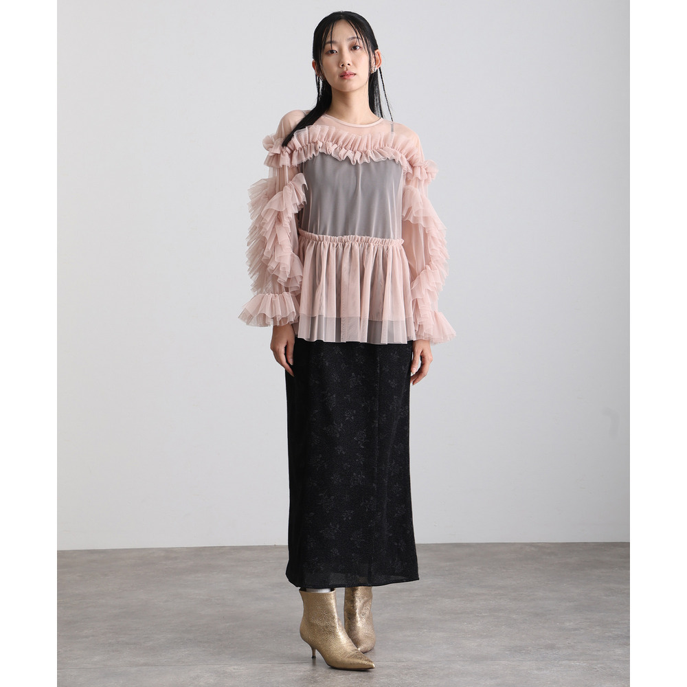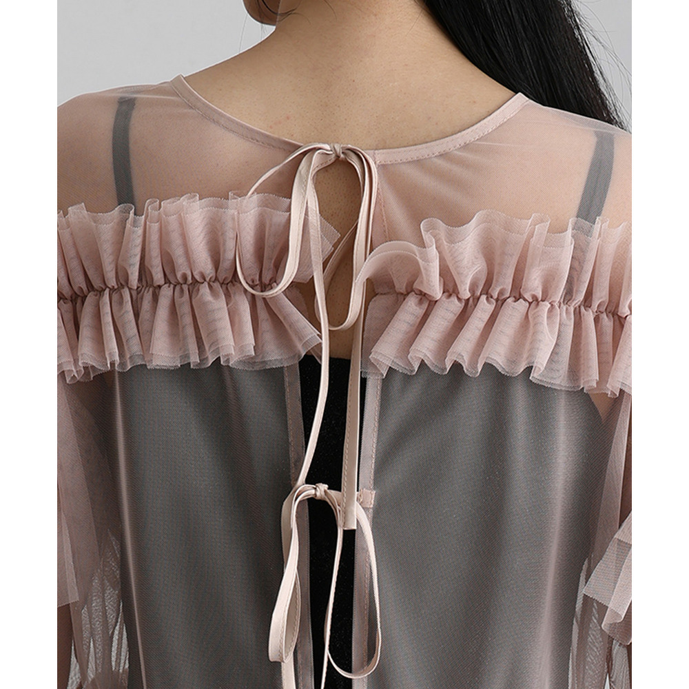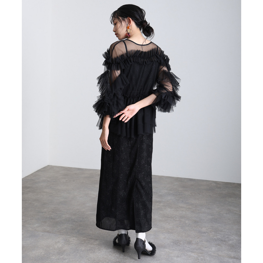 柔らかな透け感チュールに重ねられたフリルが華やかさをプラス