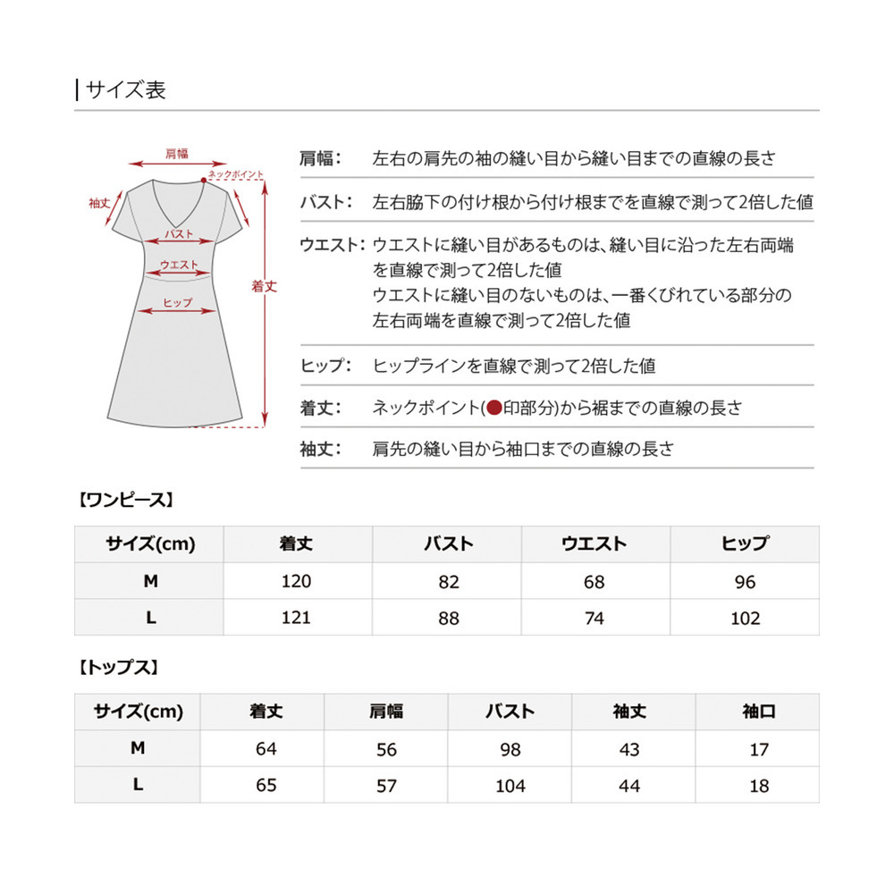 サイズ表記 着丈 L 【トップス】 着丈 【ワンピース】 身幅 121cm 57cm ウエスト幅 52cm 52cm ヒップ 37cm 44cm 肩幅 102cm 18cm 身幅 袖丈 袖口