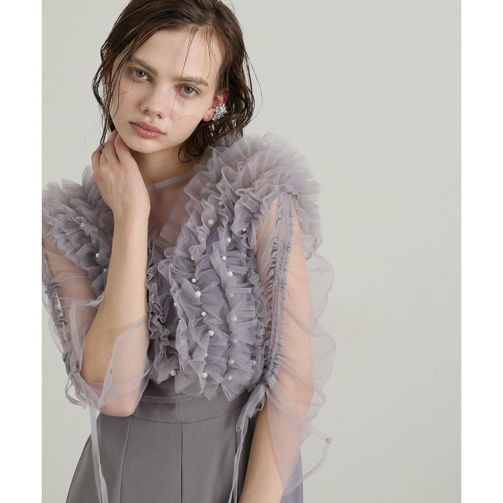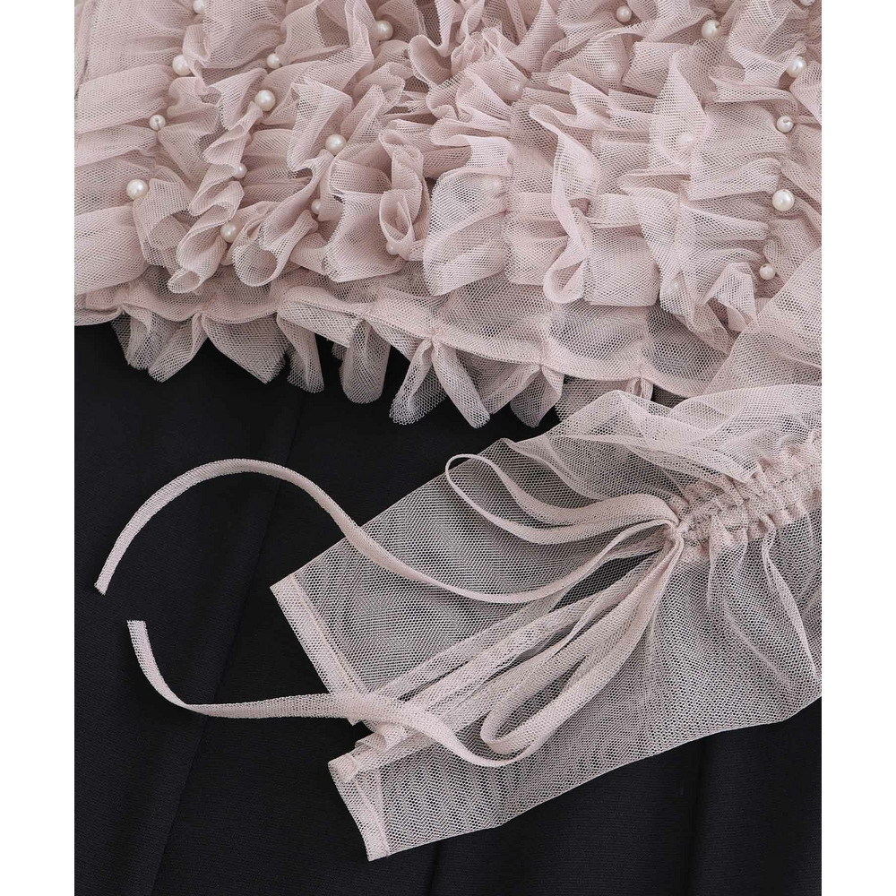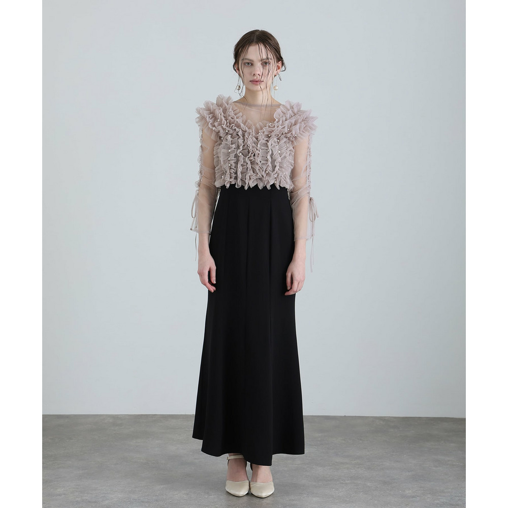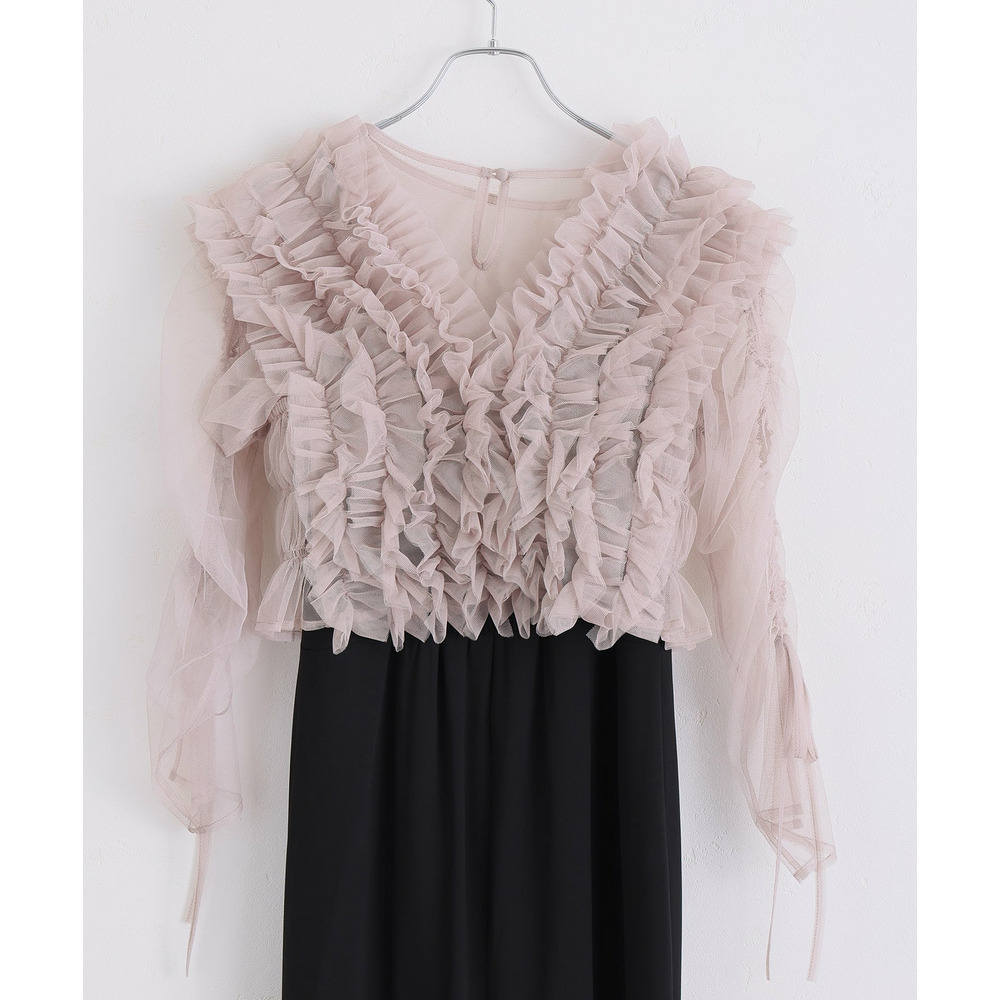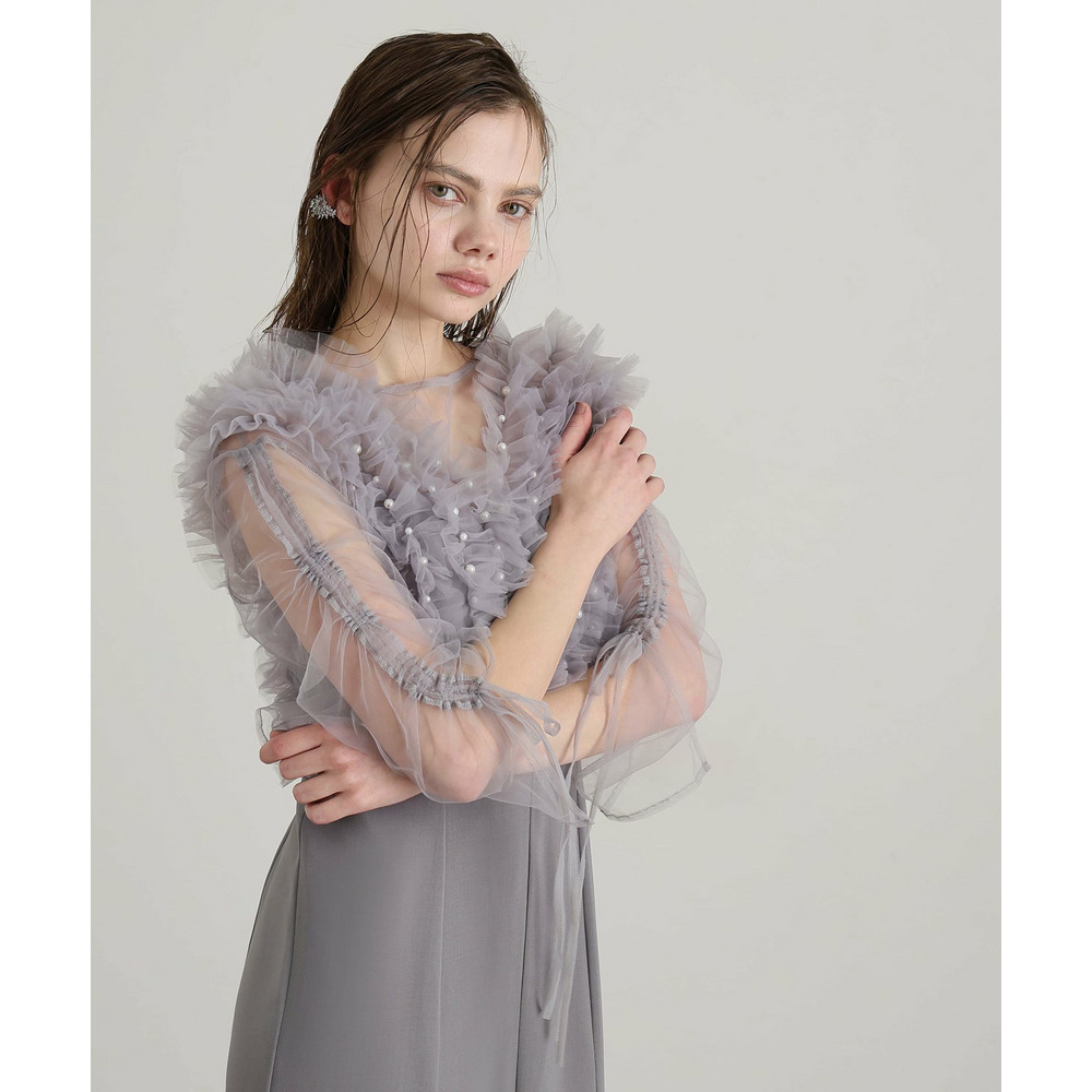 胸元の立体フリルが顔まわりを華やかに引き立てるデザイン