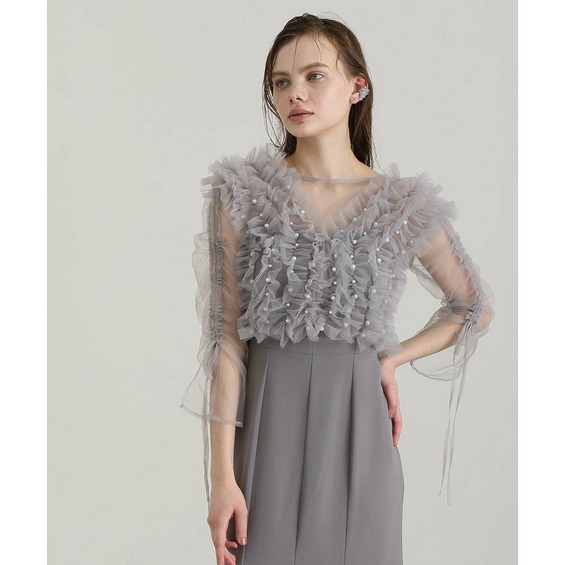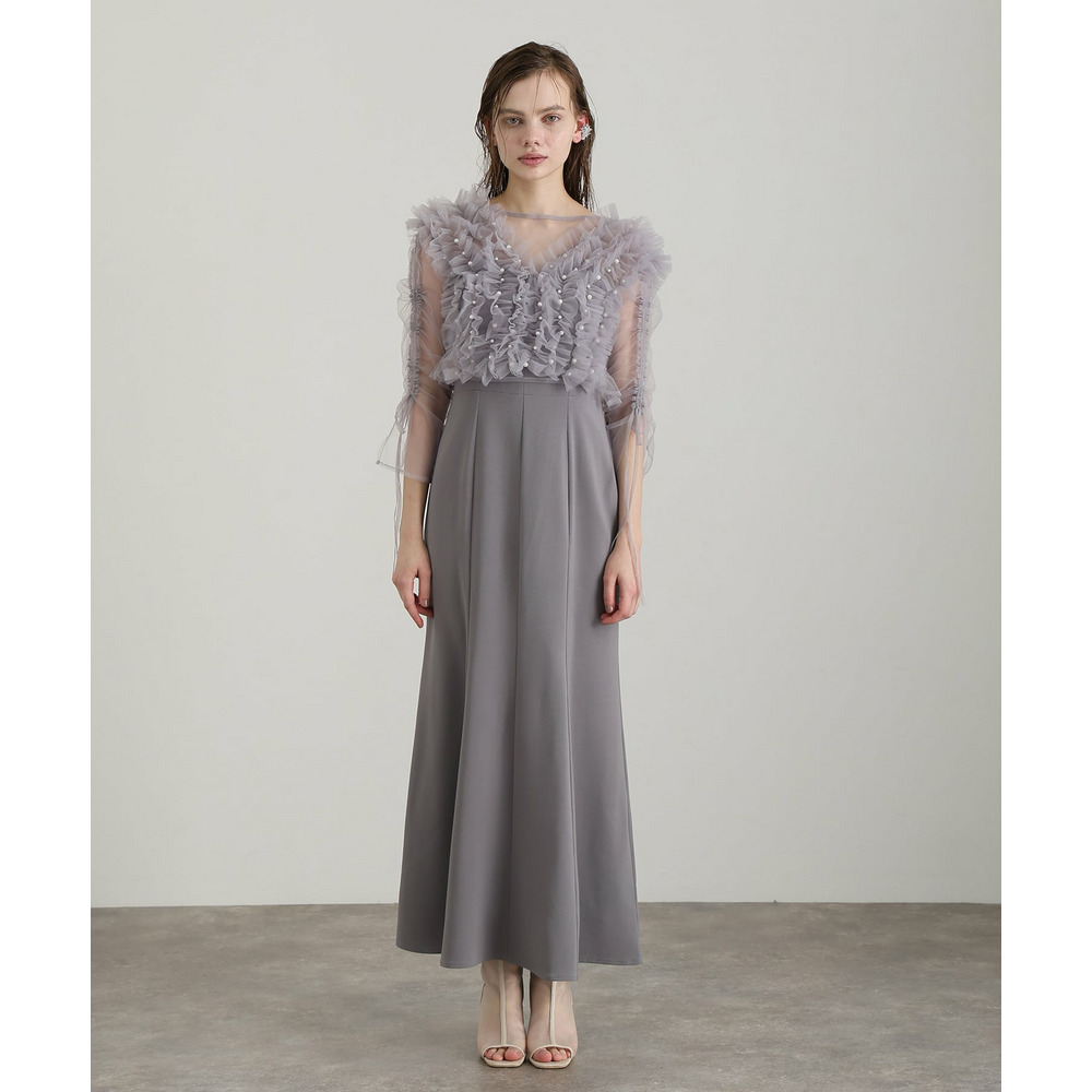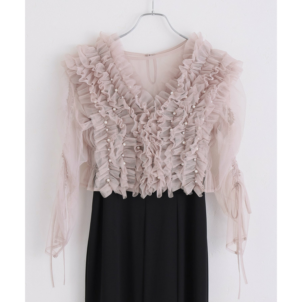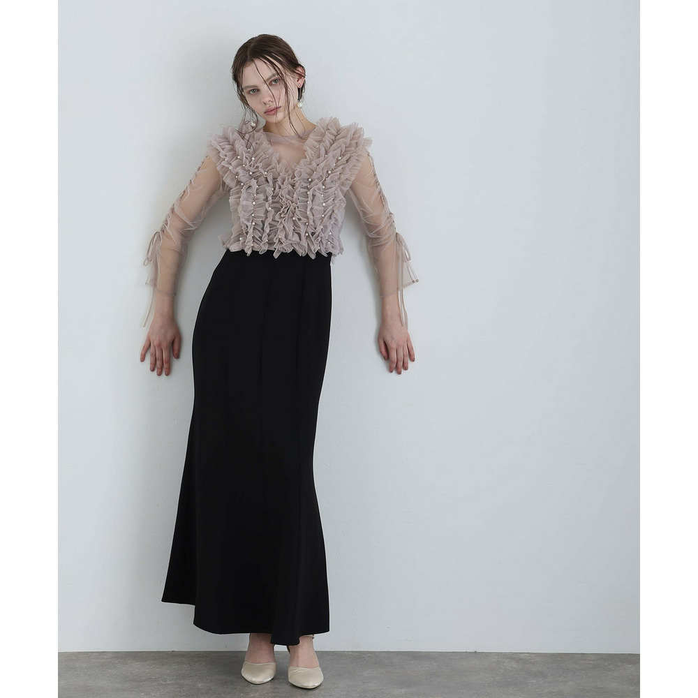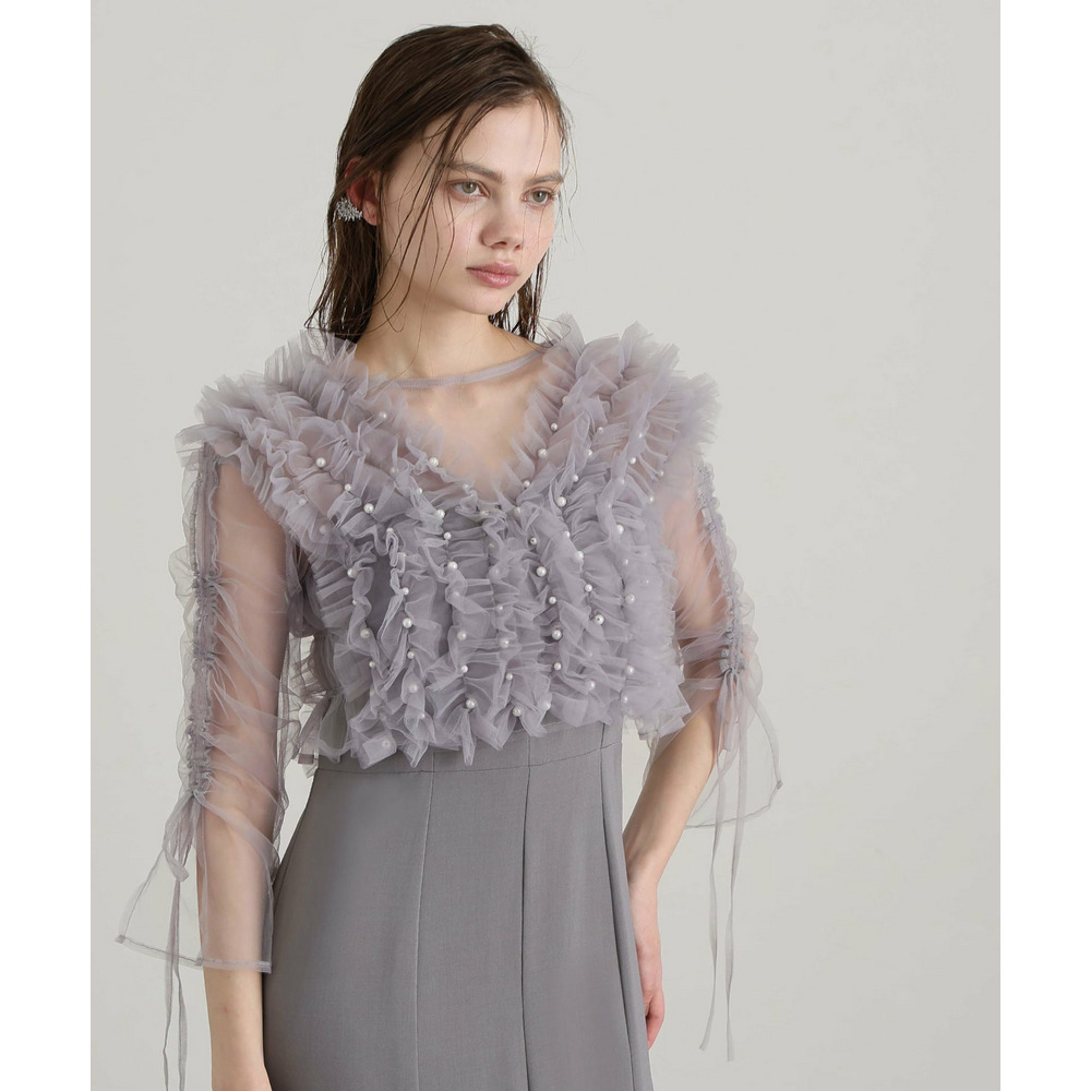 胸元の立体フリルが顔まわりを華やかに引き立てるデザイン