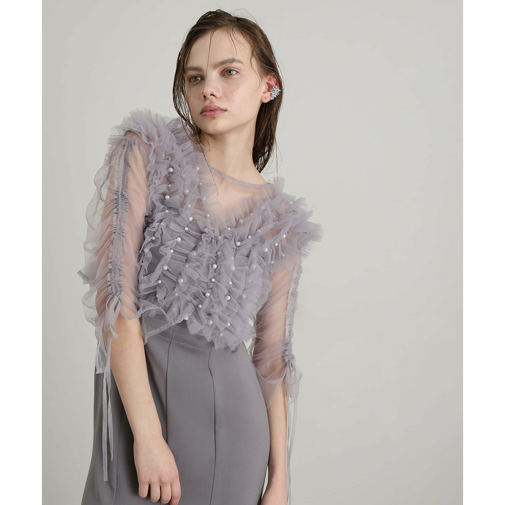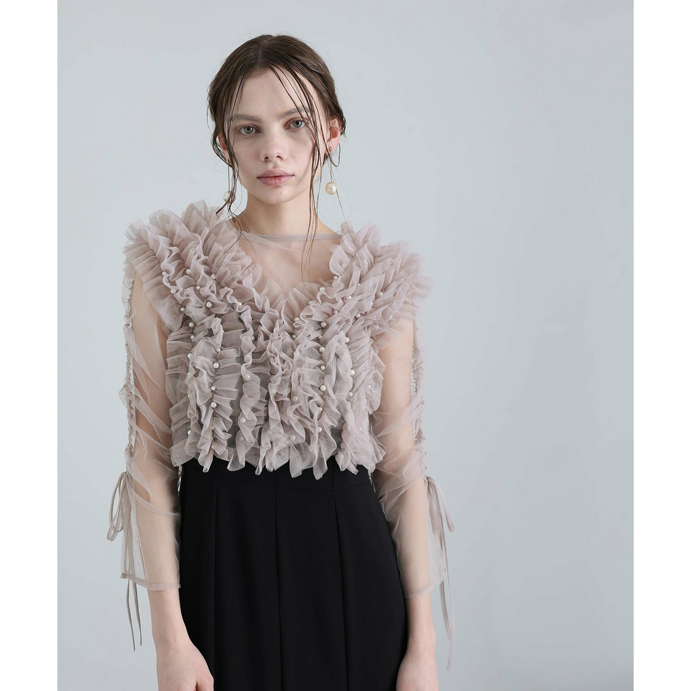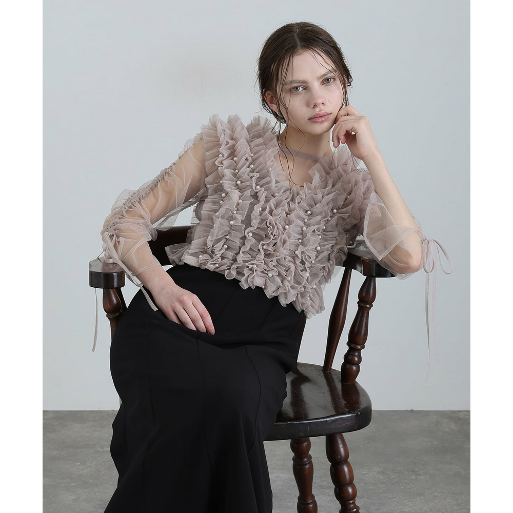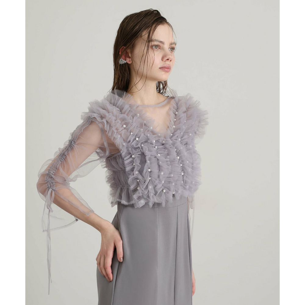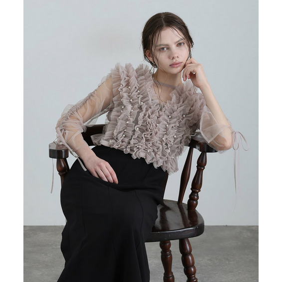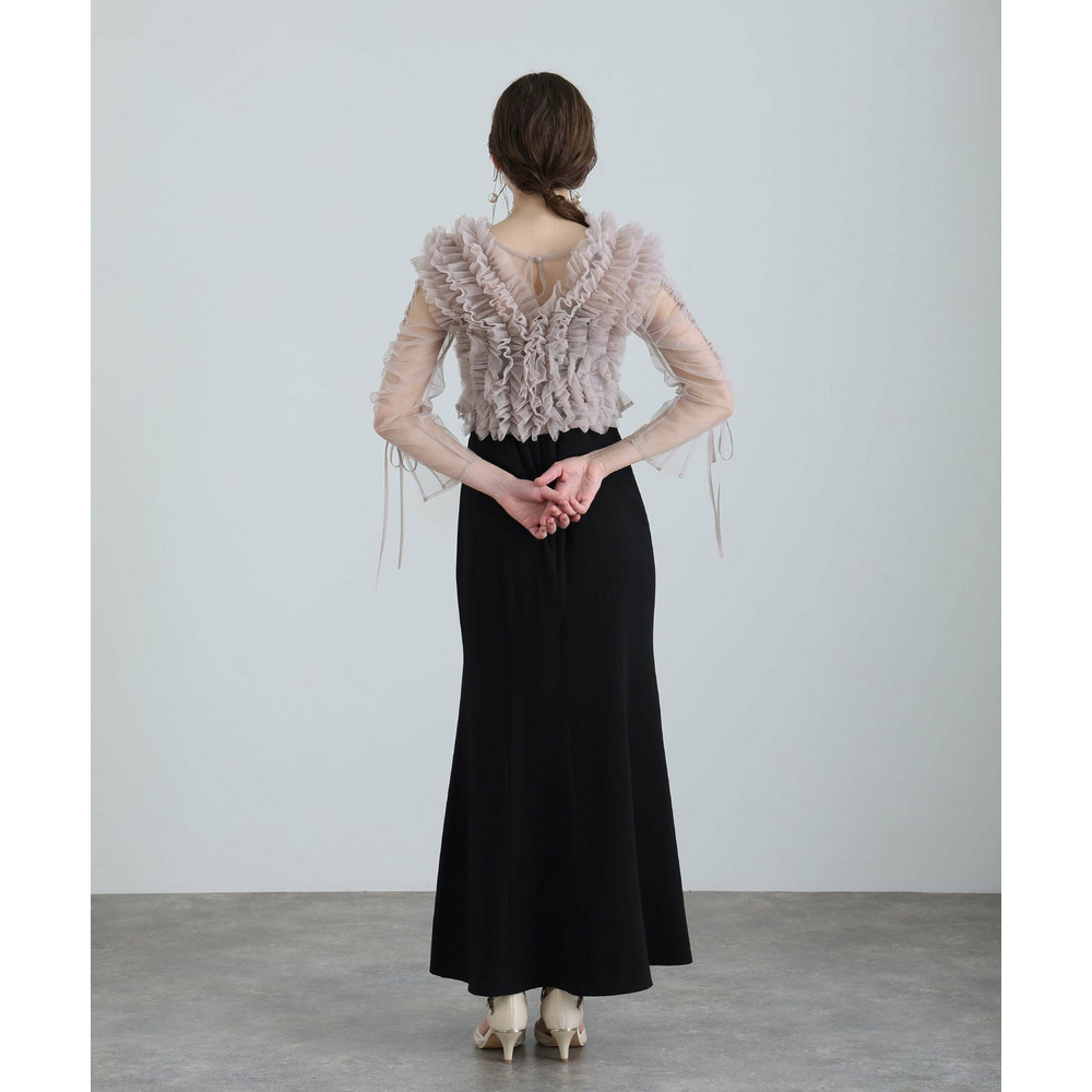 胸元の立体フリルが顔まわりを華やかに引き立てるデザイン