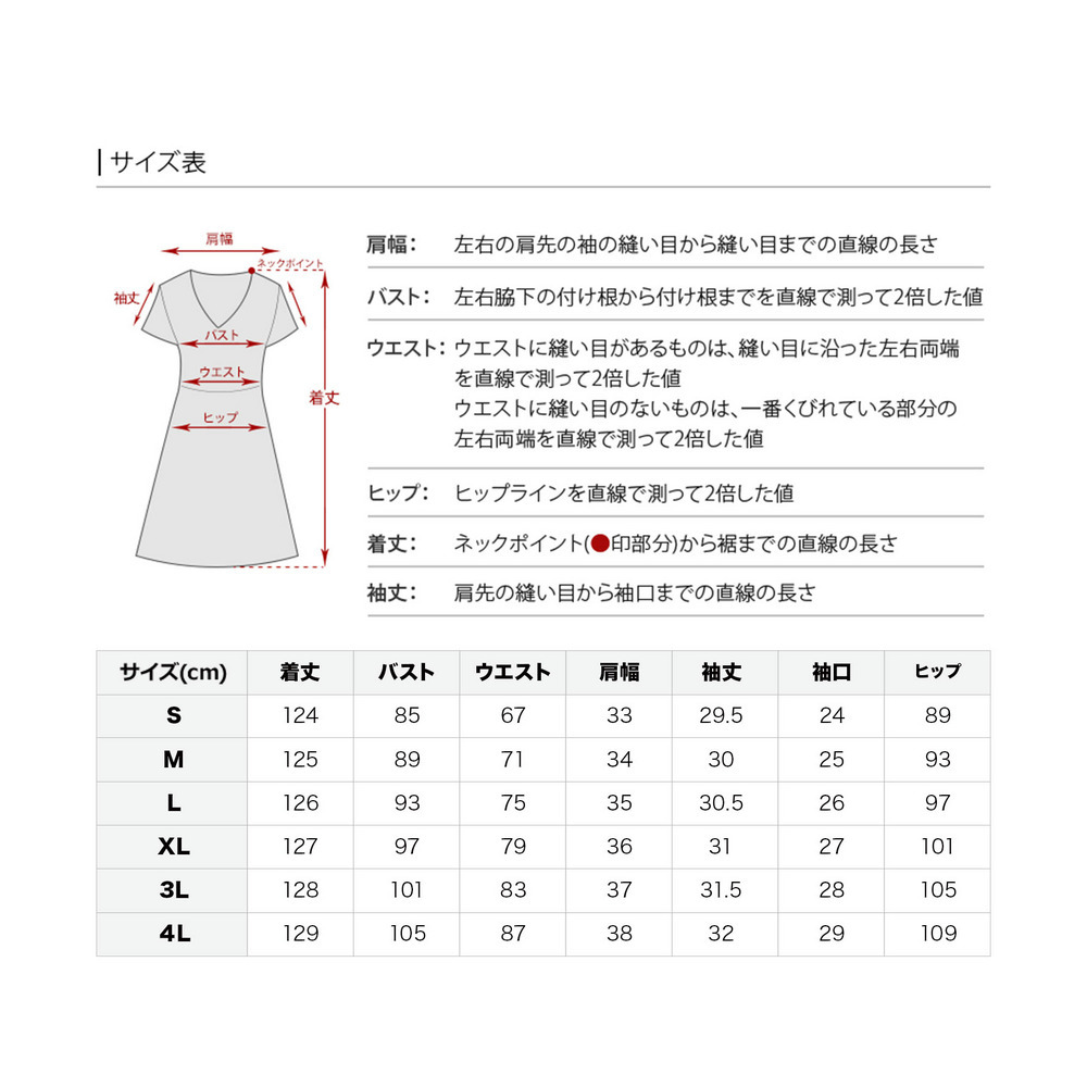 サイズ表記 L XL 3L 4L 着丈 126cm 127cm 128cm 129cm 身幅 46.5cm 48.5cm 50.5cm 52.5cm ウエスト幅 37.5cm 39.5cm 41.5cm 43.5cm 肩幅 35cm 36cm 37cm 38cm 袖丈 30.5cm 31cm 31.5cm 32cm 袖口 26cm 27cm 28cm 29cm ヒップ 97cm 101cm 105cm 109cm