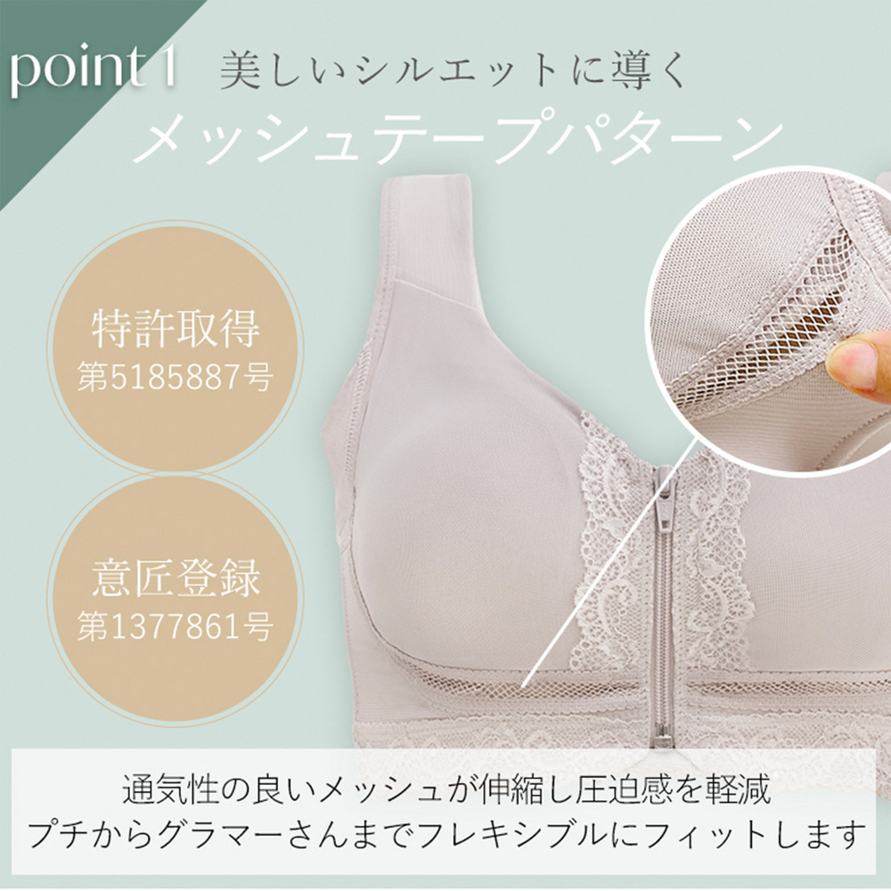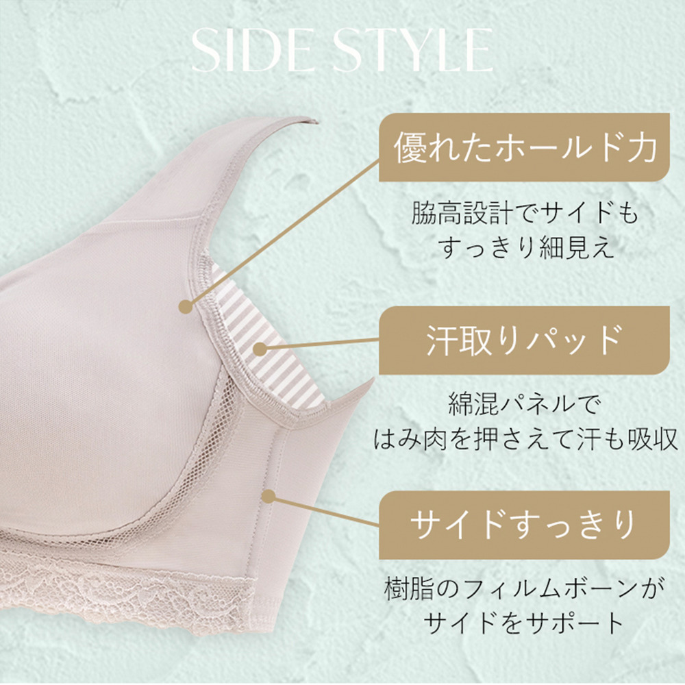 特許取得のカップ内側の立体パネルとカップ周りの独自の補整機能がバストをサイドから支え、横広がりを防止。