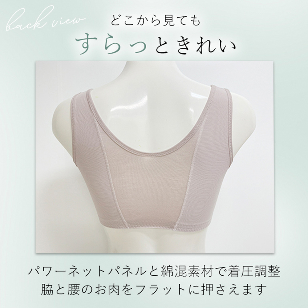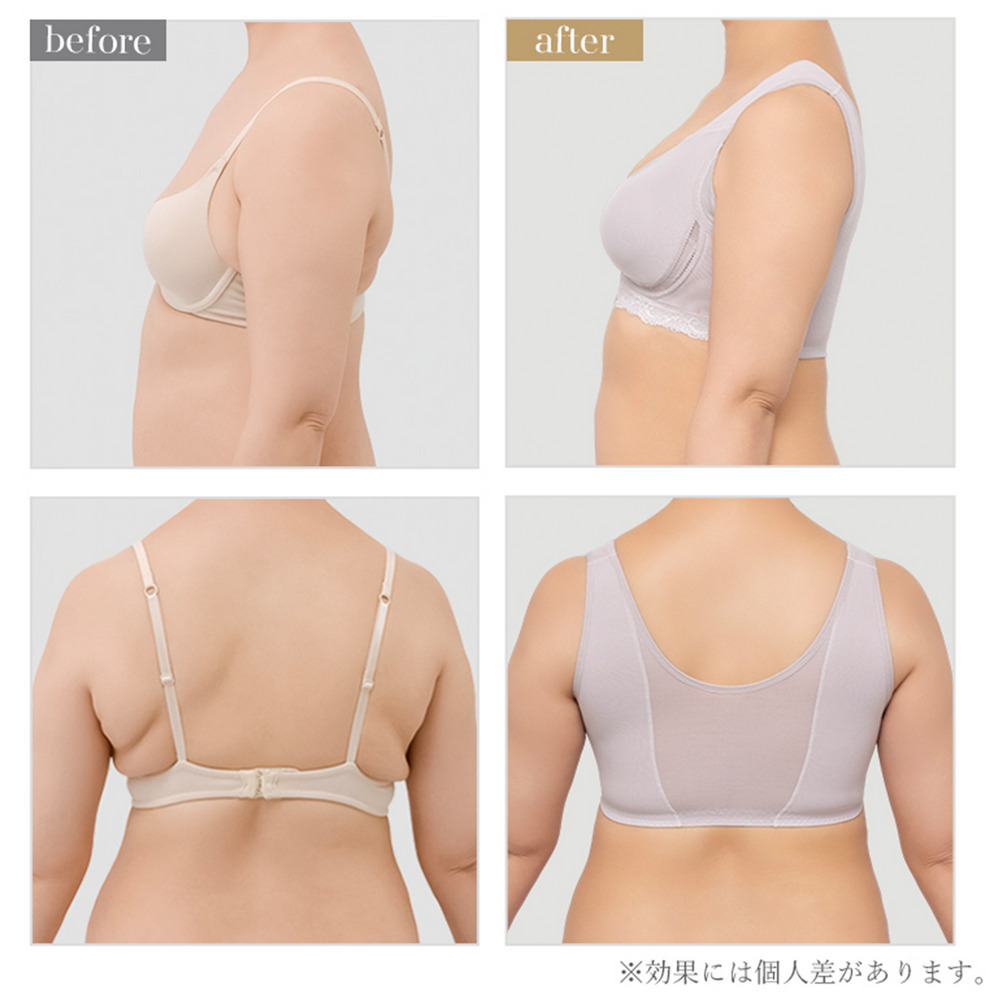 肩から脇のサポートがバストを正しい位置に引き上げ、脇肉もすっきり。さらに着圧調整設計で楽にフィットします。