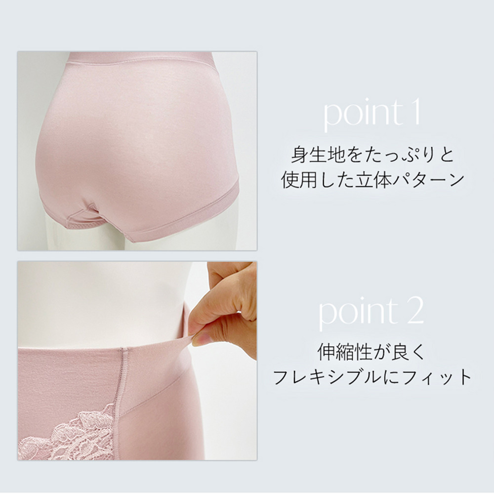 伸縮性のある身生地を二重に折り返したわさ仕様*で足口をぐるりと包み込み、お尻のお肉を逃さずサポート。