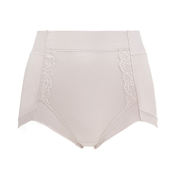 光沢落下板の細幅レースをフロント両サイドに配した、上品な補整ショーツです。流れるリーフ柄がさりげない存在感を放ち、すっきりとした印象に仕上げました。