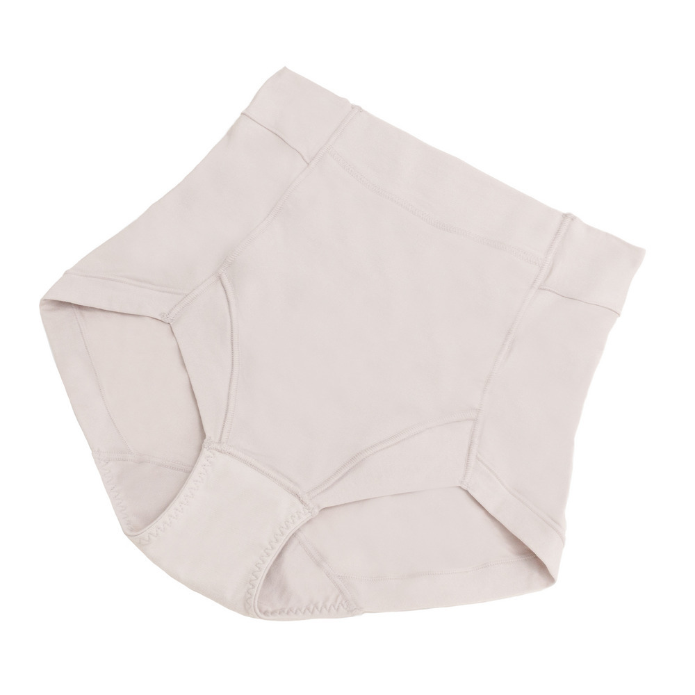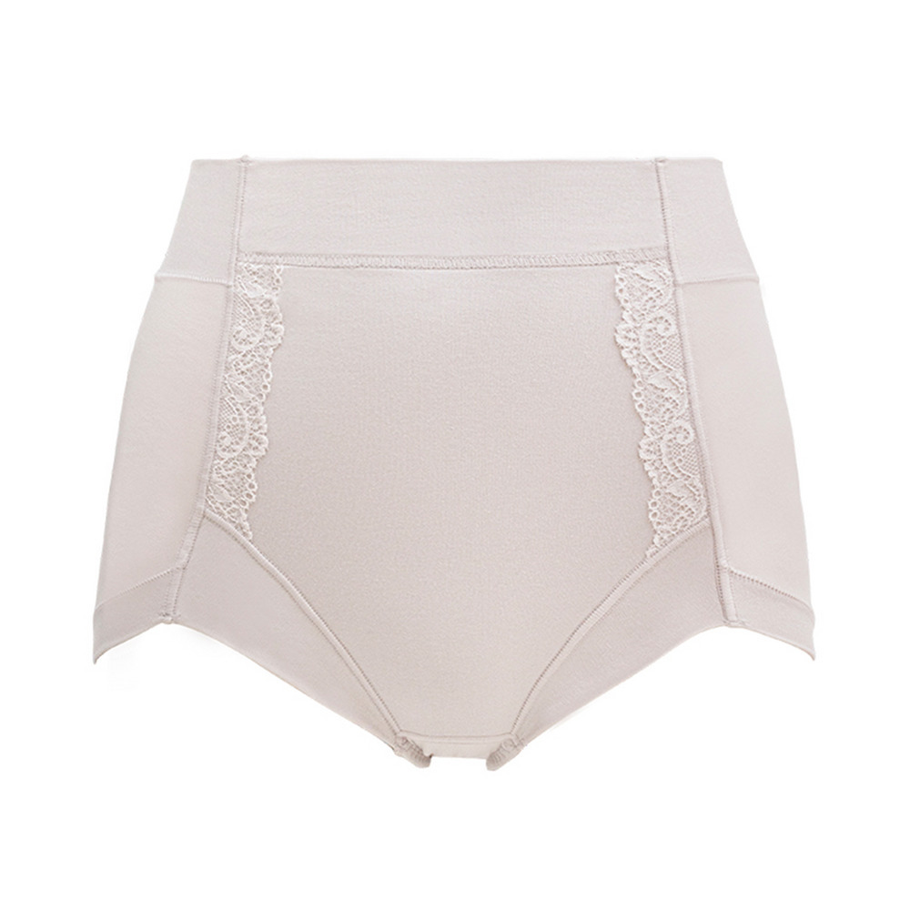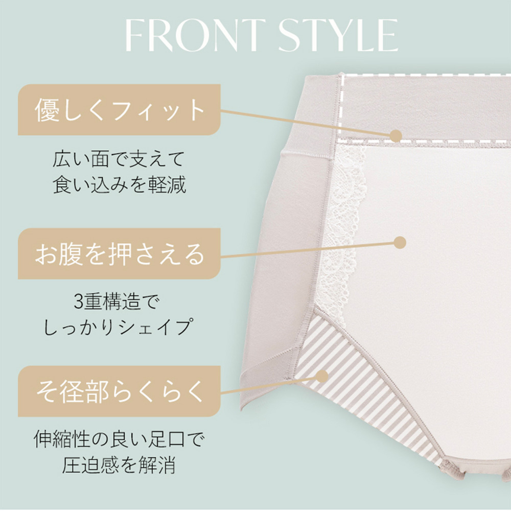 フロントは、ナイロン綿ベア天竺*の中にパワーネットを挟み込んだ三重構造で、お腹をすっきりシェイプ。