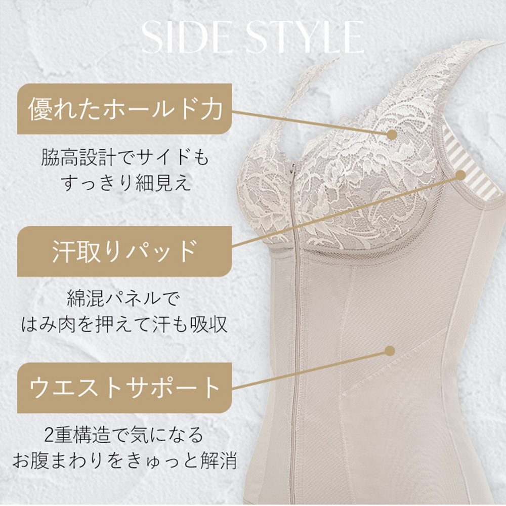 華やかなストレッチレースと、考え抜かれた補整設計の融合で、美しいシルエットと快適さを両立。「ラクしてきれいに見せたい」をかなえる一枚です。