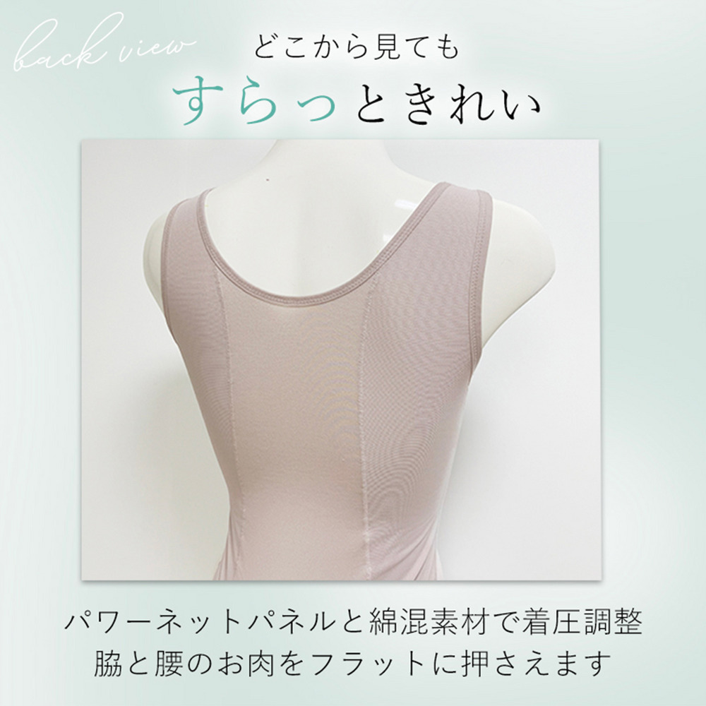 お腹や脇は身生地とパワーネットの二重仕様で広く押さえ、カップのずり上がりを防ぎつつ脇まわりもすっきり。 背中は変形ボディメイクパネルで段差になりやすい脇や腰のお肉もフラットに整え、背中のパワーネットを部分的に抜いた設計で着圧も調整可能です。