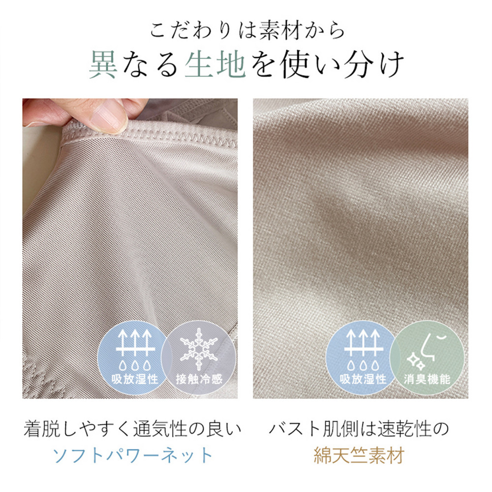 身生地には柔らかくなめらかな肌触りのナイロン綿ベア天竺*とパワーネットを使用。最高級スーピマ綿を使用した肌側のナイロン綿ベア天竺*は摩擦が少なく心地よく、接触冷感機能に加え、吸汗性と速乾性で汗をかいてもサラッと快適な着心地をキープ。