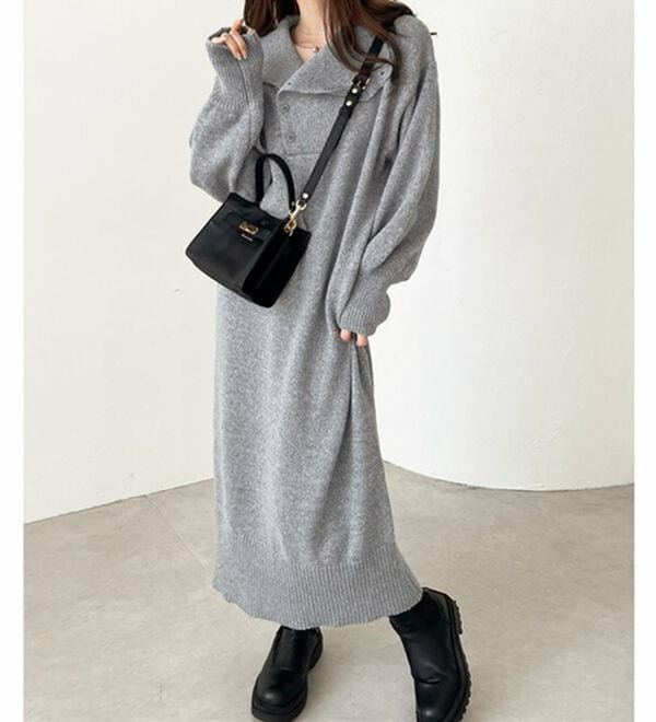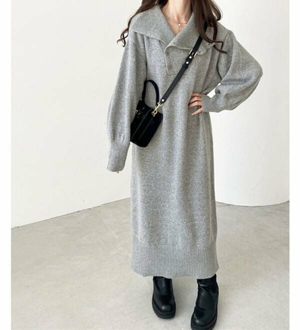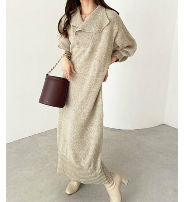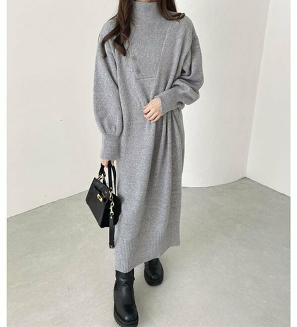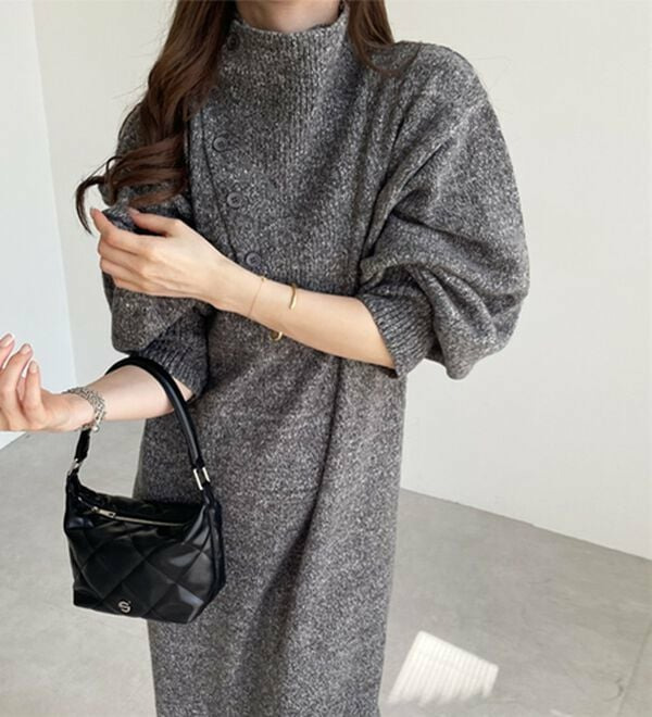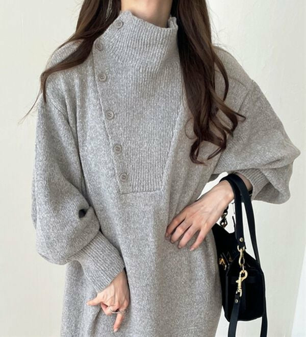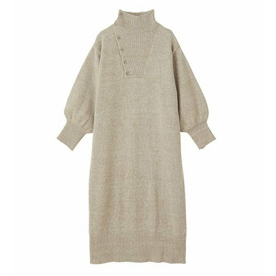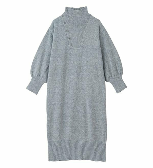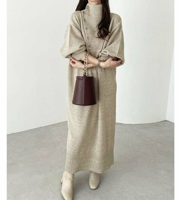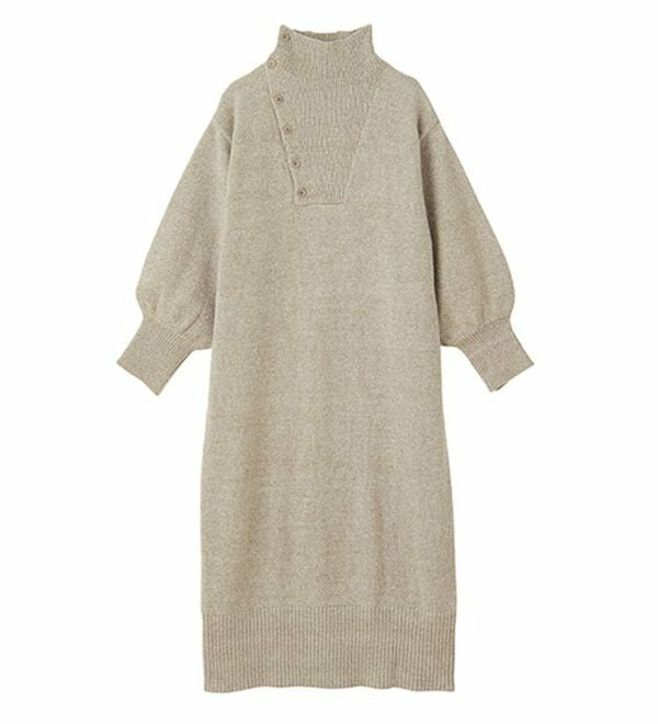 首元のボタンデザインがポイントのワンピースなので、1枚でスタイリングが決まります。