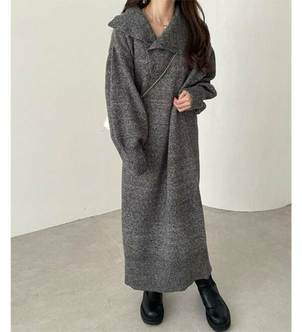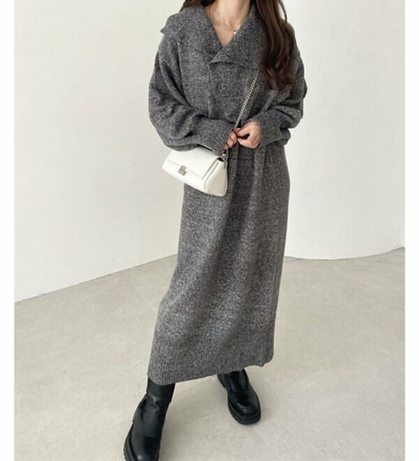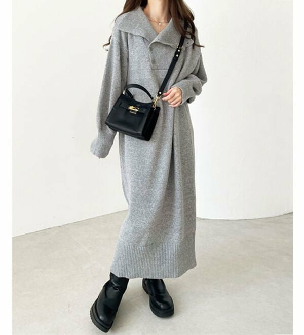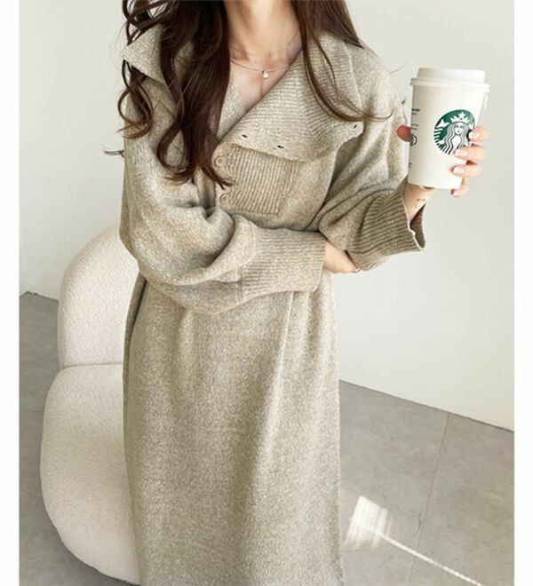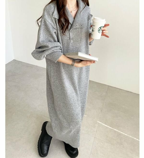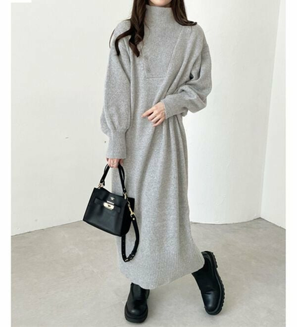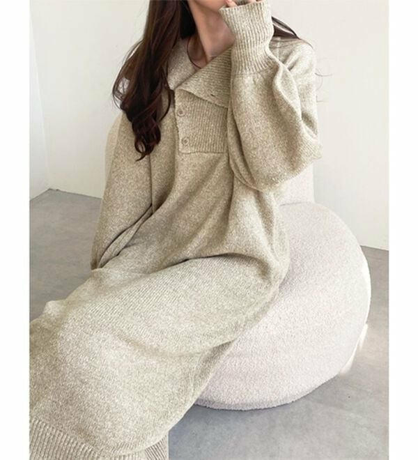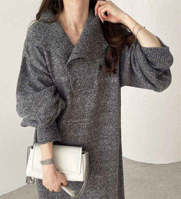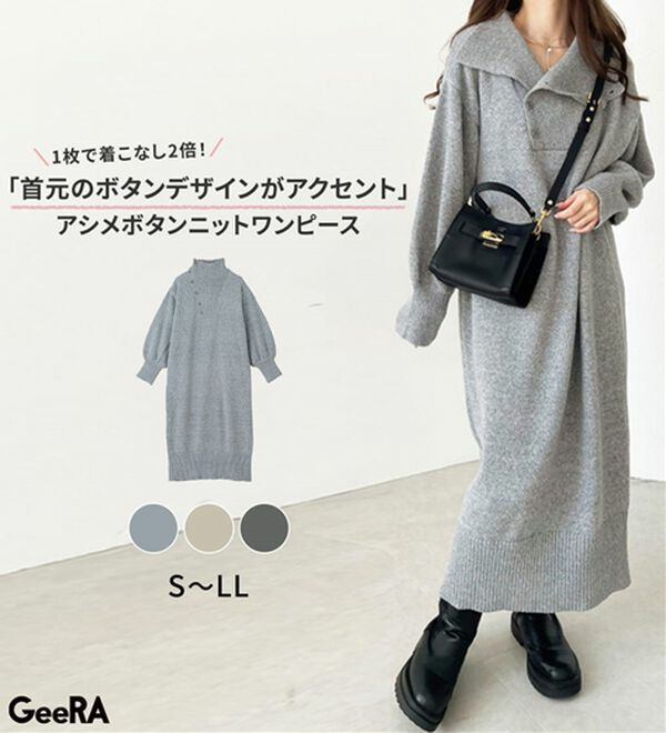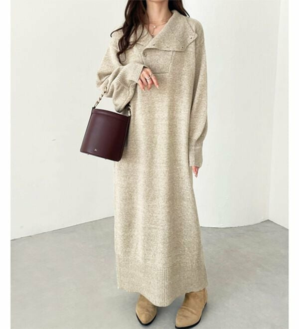 首元のボタンデザインがポイントのワンピースなので、1枚でスタイリングが決まります。