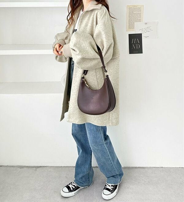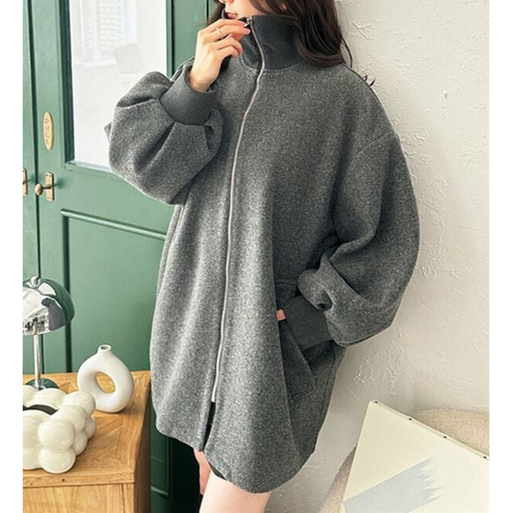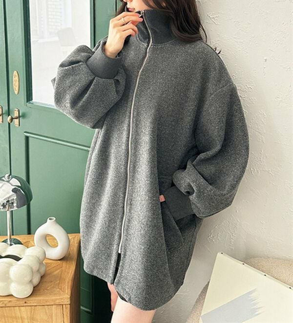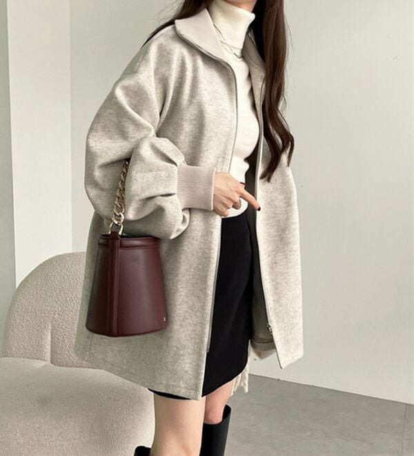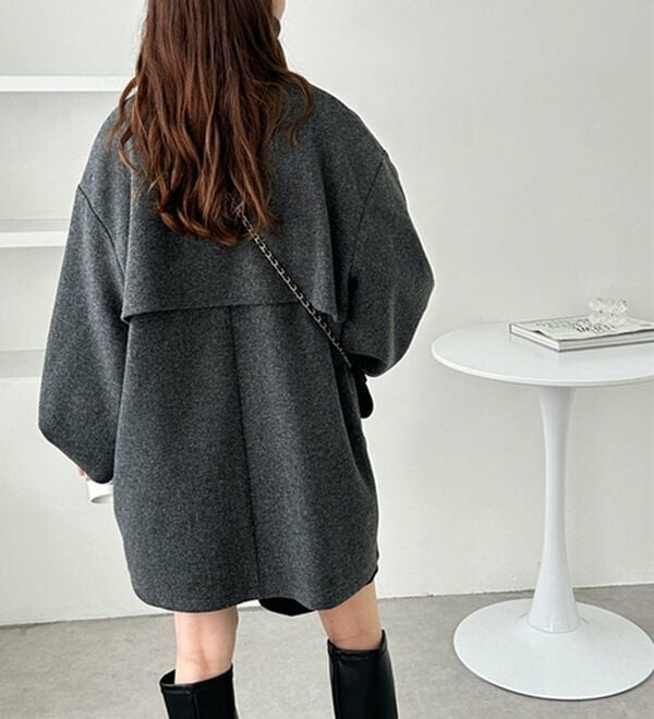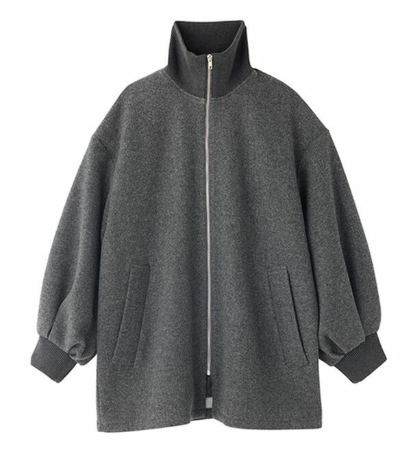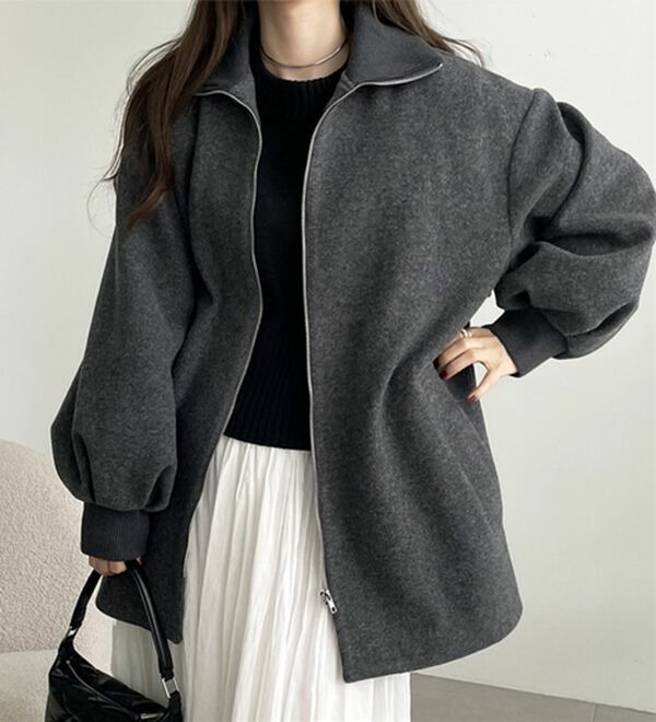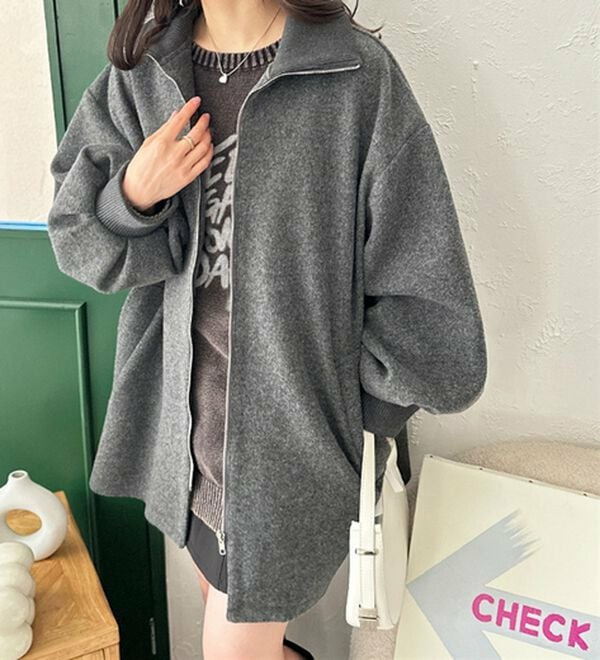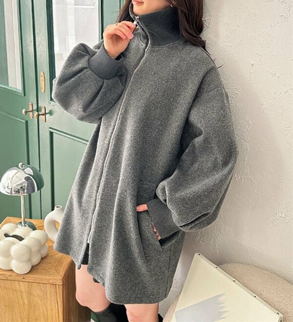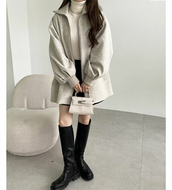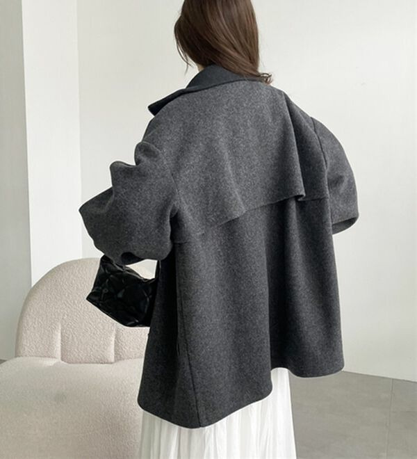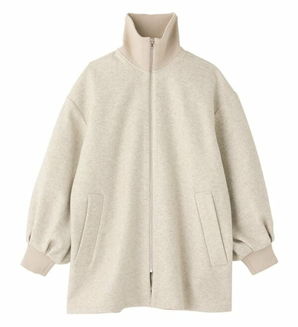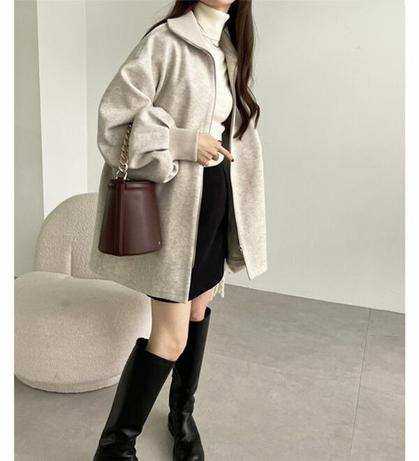 微配色のリブ衿が目を惹くフェイクウールアウター。