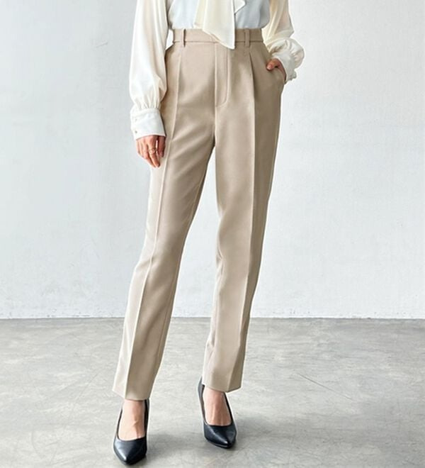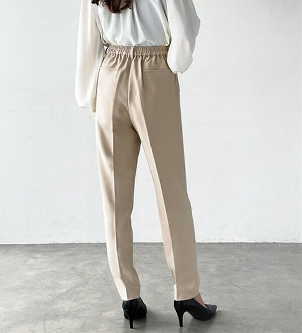 脚を長くすらっときれいに見せてくれるセンタープレス入りのテーパードパンツ。